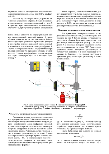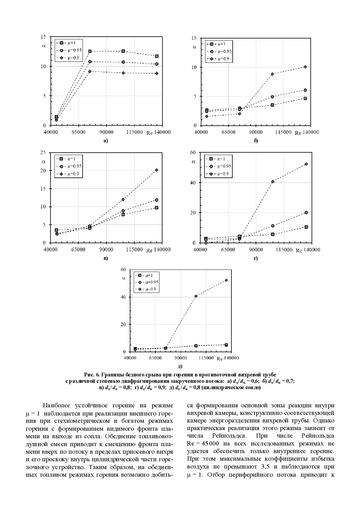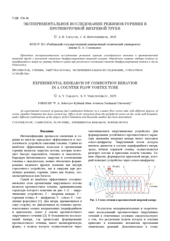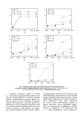 Проведено экспериментальное исследование режимов горения газообразного топлива в противоточной вихревой трубе с различной степенью диафрагмирования вихревой камеры. Определено влияние отбора воздуха из периферийного вихря на границу бедного срыва при различном сочетании степени диафрагмирования потока и числа Рейнольдса
