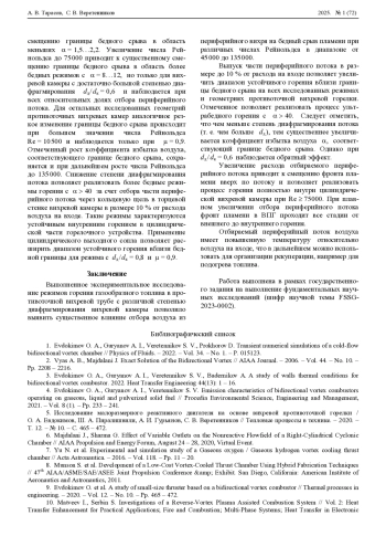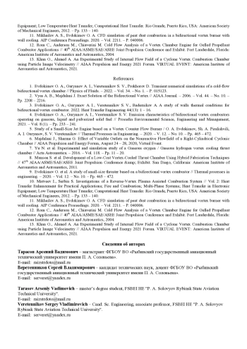 1. Evdokimov O. A., Guryanov A. I., Veretennikov S. V., Prokhorov D. Transient numerical simulations of a cold-flow bidirectional vortex chamber // Physics of Fluids. - 2022. - Vol. 34. - No. 1. - P. 015123. EDN: SXMKZL