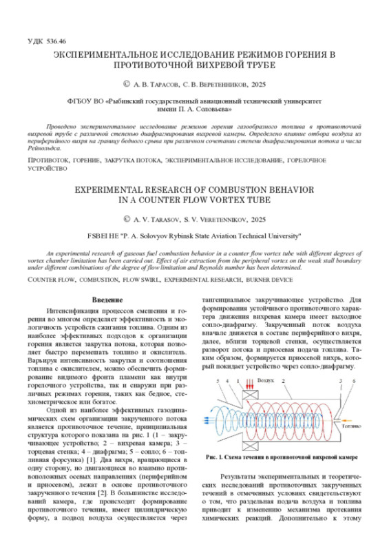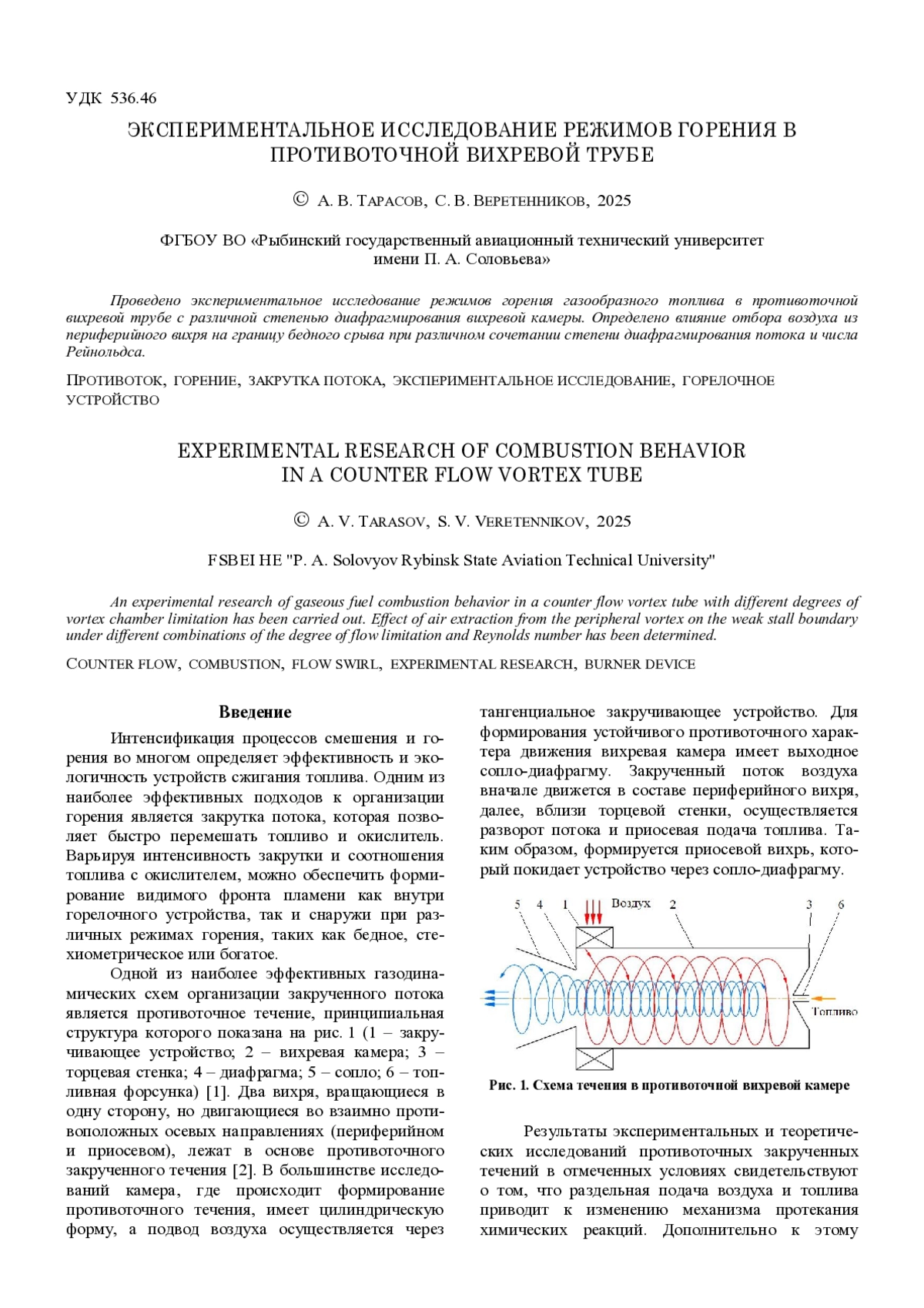 5. Исследование малоразмерного реактивного двигателя на основе вихревой противоточной горелки / О. А. Евдокимов, Ш. А. Пиралишвили, А. И. Гурьянов, С. В. Веретенников // Тепловые процессы в технике. - 2020. - Т. 12. - № 10. - С. 465 - 472. EDN: TDOOCF