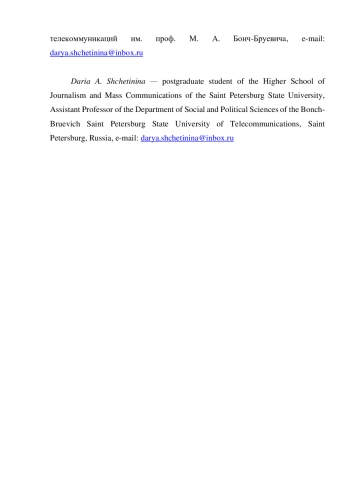2. Гуреева А. Н. Роль медиаактивности российской молодежи в процессе медиатизации политики // Вопросы теории и практики журналистики. 2020. № 9 (2). С. 325-334.