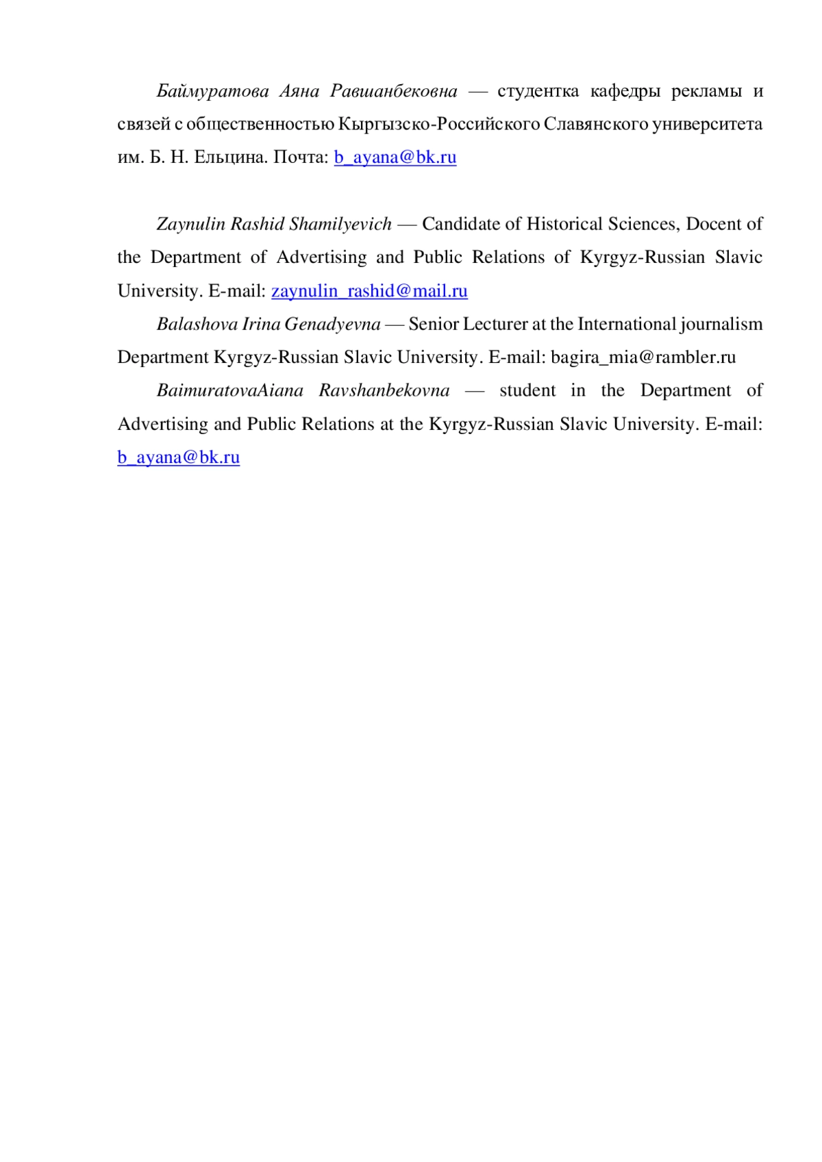 12. Камалова А.К. Креативная экономика и современная реклама в Кыргызстане. Siar-Consult // Перспективы развития рынка рекламы Кыргызстана/ C. 494. https://www.avekon.org/papers/2722.pdf 05.11.2023.