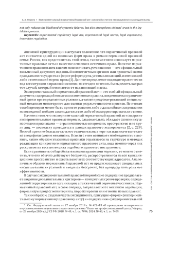 Результаты: проведенный анализ показывает, что экспериментальный формат правового регулирования минимизирует риски правоприминительных ошибок, поскольку на этапе тестирования можно выявить недостатки и своевременно их исправить. Практические примеры подтверждают, что подобный акт облегчает внедрение новых правил в ограниченных масштабах, не затрагивая всю правовую систему.