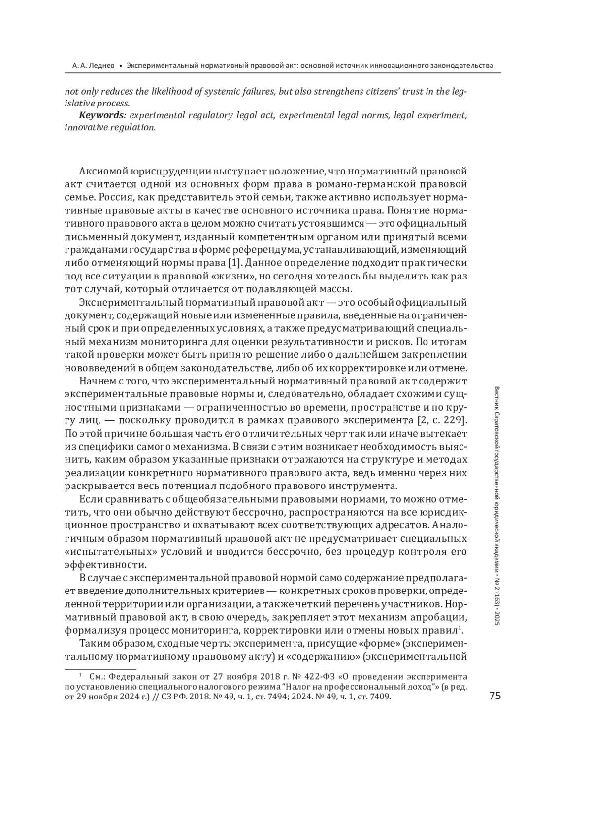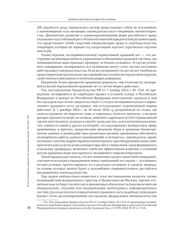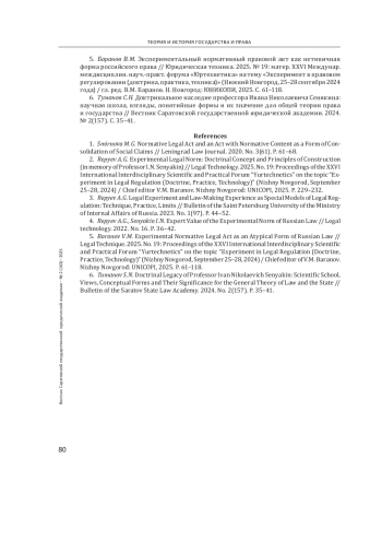5. Баранов В. М. Экспериментальный нормативный правовой акт как нетипичная форма российского права // Юридическая техника. 2025. № 19: матер. XXVI Междунар. междисциплин. науч.-практ. форума “Юртехнетика” на тему “Эксперимент в правовом регулировании (доктрина, практика, техника)” (Нижний Новгород, 25-28 сентября 2024 года) / гл. ред. В. М. Баранов. Н. Новгород: ЮНИКОПИ, 2025. С. 61-118. EDN: SZCOLL