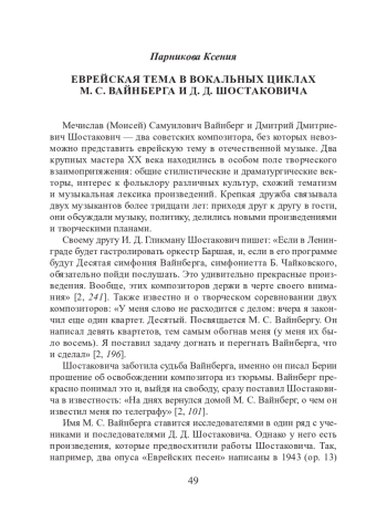 ПАРНИКОВА К. ЕВРЕЙСКАЯ ТЕМА В ВОКАЛЬНЫХ ЦИКЛАХ М. С. ВАЙНБЕРГА И Д. Д. ШОСТАКОВИЧА // ИССЛЕДОВАНИЯ МОЛОДЫХ МУЗЫКОВЕДОВ. 2024. № 8