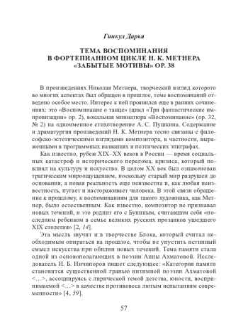 Как известно, рубеж XIX–XX веков в России — время социальных катастроф и исторического перелома, кризиса, который повлиял на культуру и искусство. В целом XX век был ознаменован трагическим мироощущением, поскольку старый мир разрушен до основания, а новая реальность еще неизвестна и, как любая неизвестность, пугает и настораживает человека. В этой связи обращение к прошлому, к воспоминаниям для такого художника, как Метнер, было естественным. Как известно, композитор не признавал новых течений, и это роднит его с Буниным, считавшим себя «последним ребенком в семье великих русских прозаиков ушедшего XIX столетия» [2, 14].
