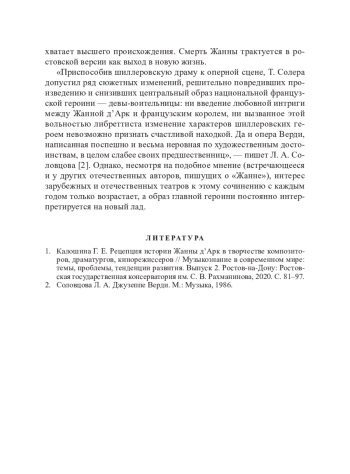 1. Калошина Г. Е. Рецепция истории Жанны д’Арк в творчестве композиторов, драматургов, кинорежиссеров // Музыкознание в современном мире: темы, проблемы, тенденции развития. Выпуск 2. Ростов-на-Дону: Ростовская государственная консерватория им. С. В. Рахманинова, 2020. С. 81–97.