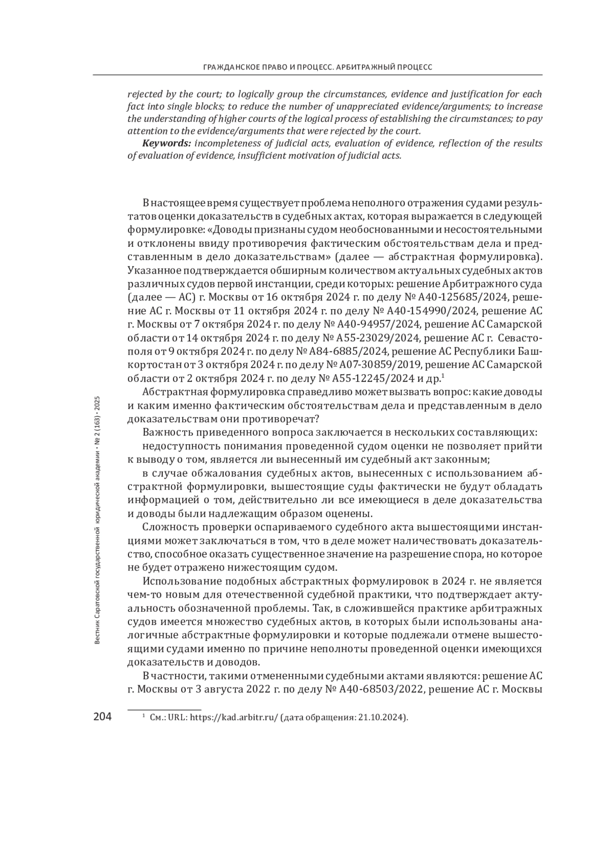 В настоящее время существует проблема неполного отражения судами результатов оценки доказательств в судебных актах, которая выражается в следующей формулировке: «Доводы признаны судом необоснованными и несостоятельными и отклонены ввиду противоречия фактическим обстоятельствам дела и представленным в дело доказательствам» (далее — абстрактная формулировка).