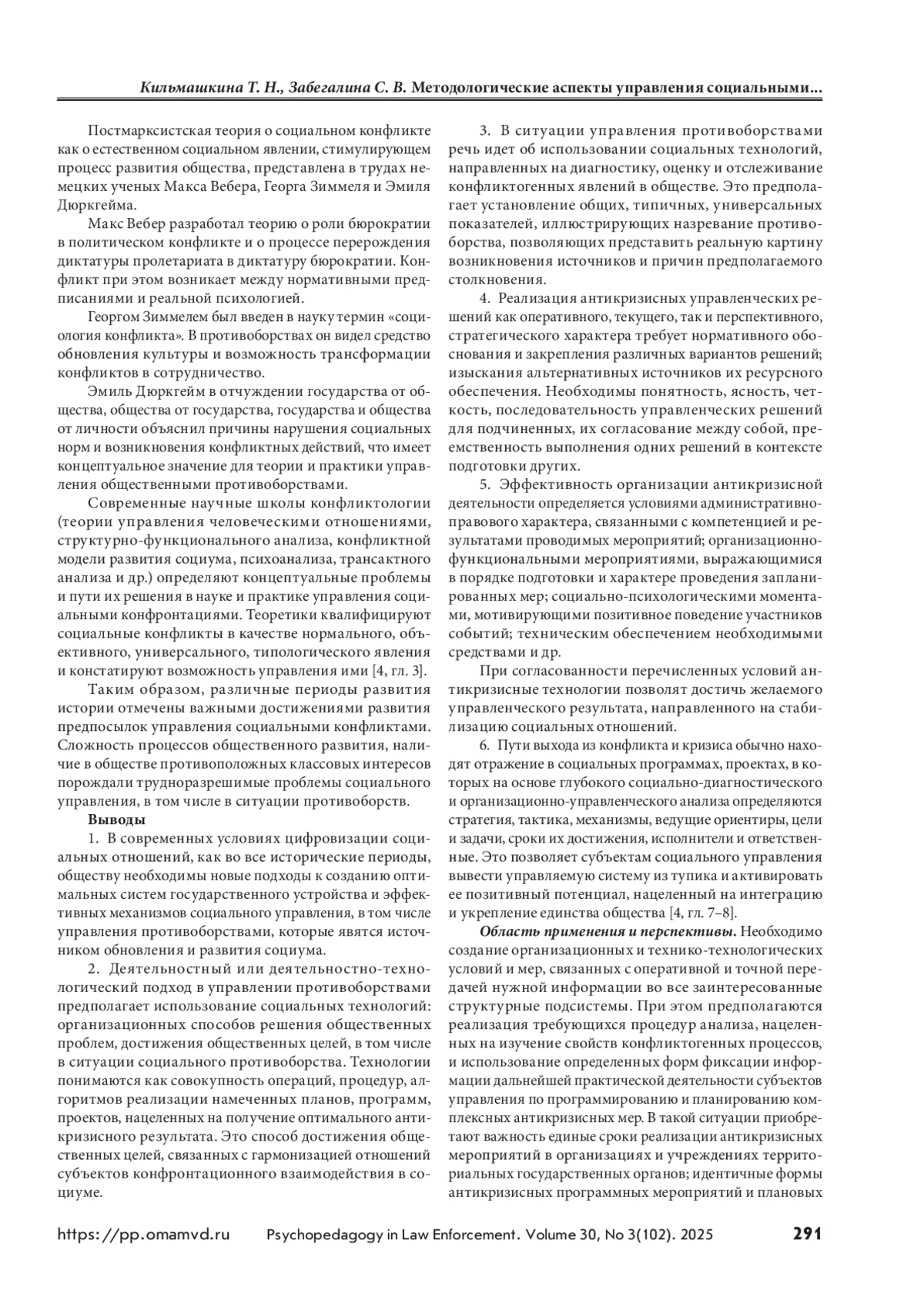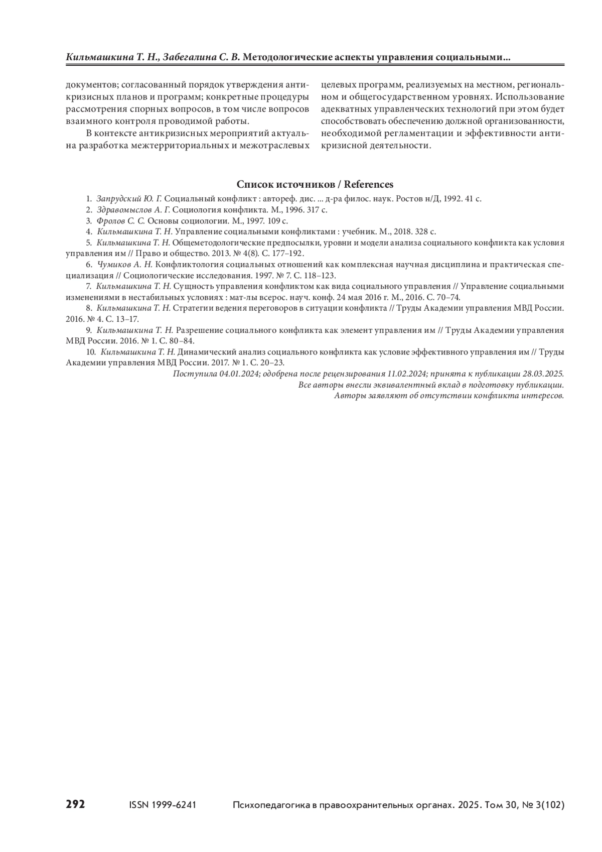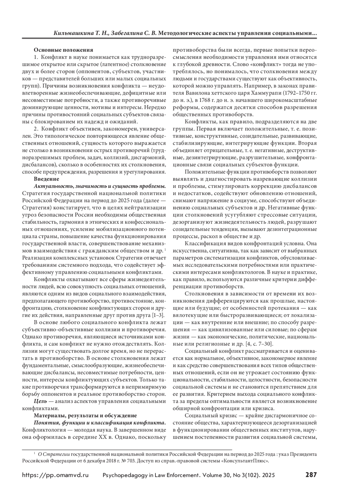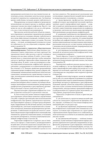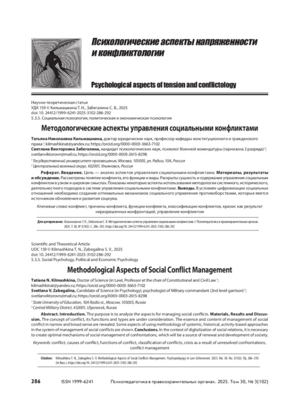 КИЛЬМАШКИНА Т. Н., ЗАБЕГАЛИНА С. В. МЕТОДОЛОГИЧЕСКИЕ АСПЕКТЫ УПРАВЛЕНИЯ СОЦИАЛЬНЫМИ КОНФЛИКТАМИ // ПСИХОПЕДАГОГИКА В ПРАВООХРАНИТЕЛЬНЫХ ОРГАНАХ. 2025. № 3 (102), ТОМ 30