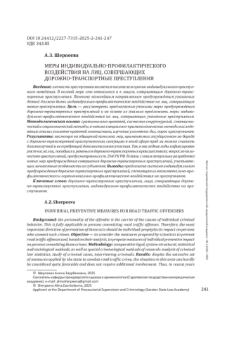3. Шерпеева А. З. Некоторые социально-демографические характеристики преступников, совершающих дорожно-транспортные преступления // Вестник Казанского юридического института МВД России. 2021. № 1(43). С. 81-85. EDN: BKIDON