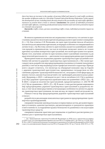 Введение: личность преступника является носителем причин индивидуального преступного поведения. В полной мере это относится и к лицам, совершающим дорожно-транспортные преступления. Поэтому важнейшим направлением предупреждения указанных деяний должно быть индивидуально-профилактическое воздействие на лиц, совершающих такие преступления. Цель - рассмотреть предлагаемые учеными меры предупреждения дорожно-транспортных преступлений и на основе их анализа предложить меры индивидуально-профилактического воздействия на лиц, совершающих указанные преступления. Методологическая основа: сравнительно-правовой, системно-структурный, статистический и социологический методы, а также специально-криминологические методы исследования: анализ уголовно-правовой статистики, изучение уголовных дел, опрос преступников.