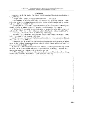 7. Гридасова Л. В. Криминологическое исследование дорожно-транспортных преступлений, связанных с нарушением правил дорожного движения: дис. … канд. юрид. наук. Барнаул, 2005. 204 с. EDN: NNQUXJ