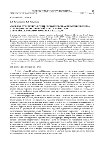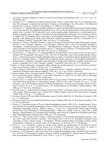 5. Календарова В.В. Ведомственная и отраслевая периодика в общественной жизни начала XIX века // Вестник Удмуртского университета. Серия “История и филология”. 2021. Т. 31. № 4. С. 710-720. EDN: UJGJYO