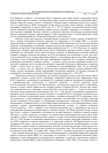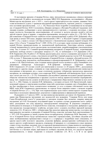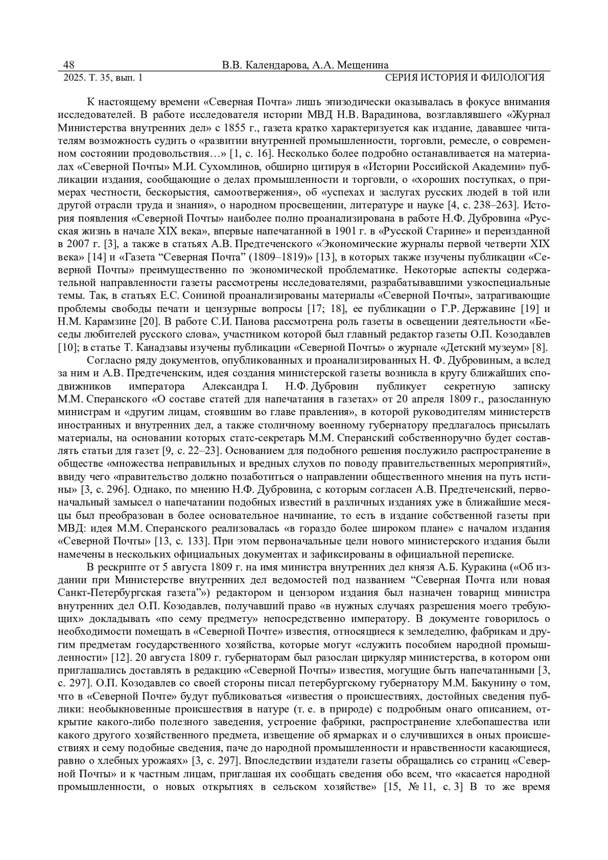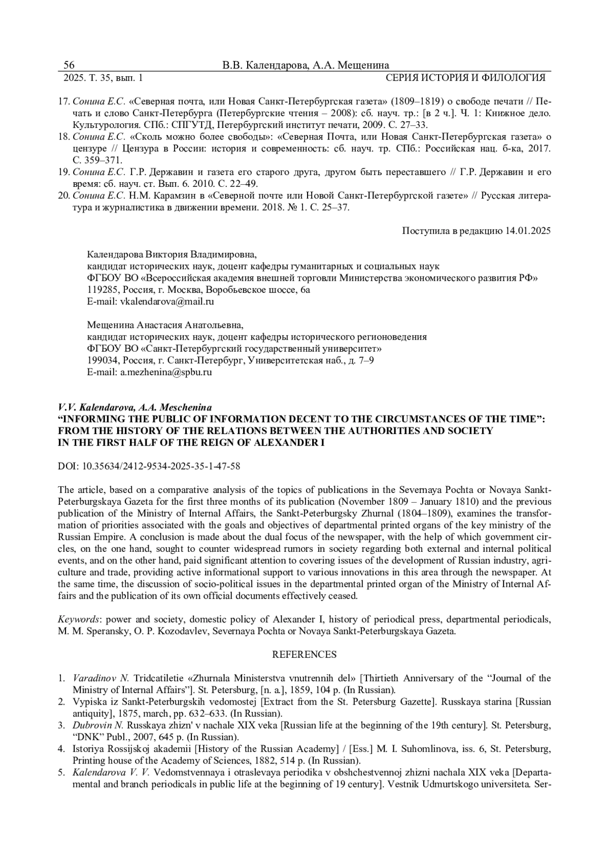 7. Календарова В.В. Министерские периодические издания в контексте реформаторских планов правительственных кругов в первой четверти XIX века // М.М. Сперанский и опыт социально-политического реформаторства в отечественной истории: сб. науч. ст. по итогам Всероссийской научно-практической конференции 20-21сентября 2022 г., г. Владимир / редкол.: Е.М. Петровичева [и др.]. Владимир: Транзит-ИКС, 2023. С. 61-70. EDN: EDDEUU