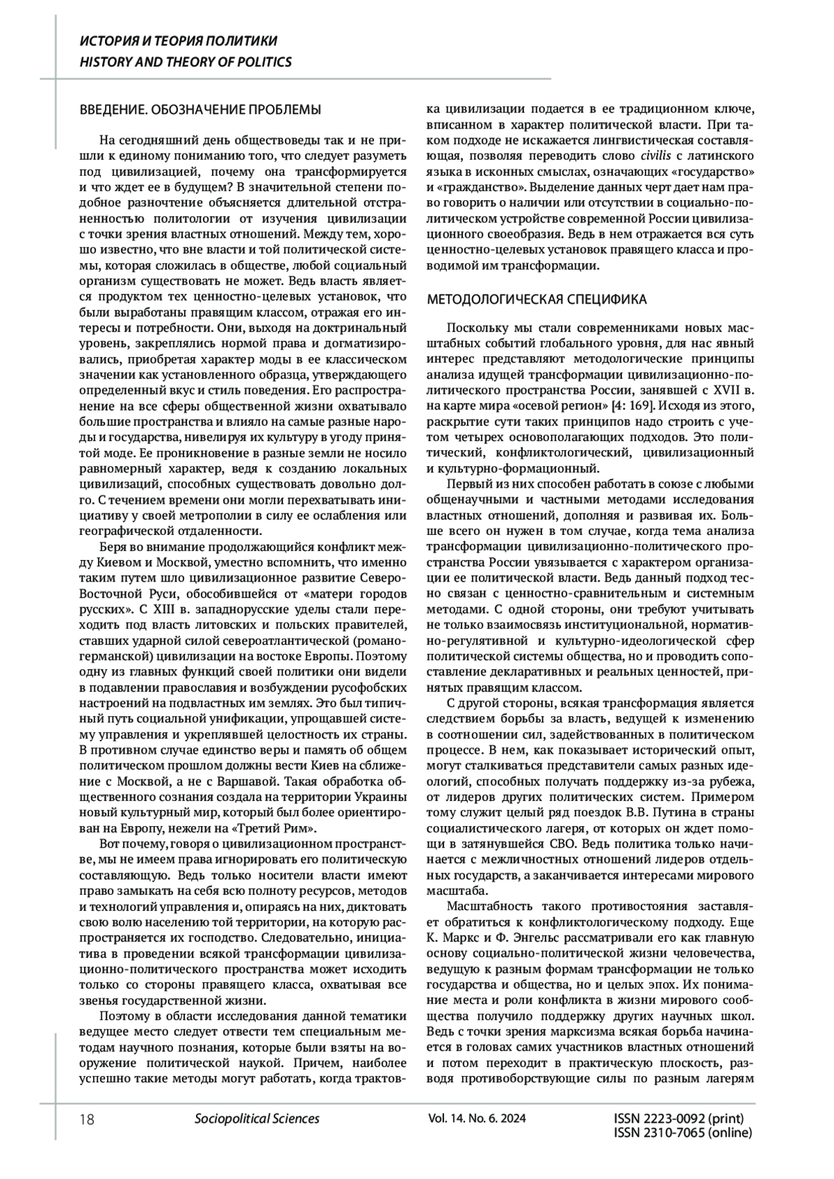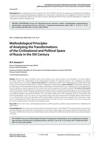 Исходя из характера политической науки, которая ориентирована на изучение власти, составляющей основу всех социальных отношений, автор раскрывает свое понимание методологических принципов анализа изменений цивилизационно-политического пространства России в XXI в. Цель исследования сводится к выявлению специфики работы тех методологических принципов, использование которых поможет раскрыть дальнейший путь трансформации цивилизационно-политического пространства России. Методы исследования. Достижение поставленной цели требует применения некоторых специальных методов: политического, конфликтологического, культурно-формационного и цивилизационного. В силу своей значимости они трактуются как исследовательские подходы, идущие в сочетании с ценностно-сравнительным и системным методами. Результаты исследования показали, что более глубокое понимание трансформации цивилизационно-политического пространства России может дать комплексное использование четырех методологических принципов научного анализа. Это принципы социально-политических фактов, социально-политических дефиниций, социально-политического поведения и социально-исторического детерминизма. Их применение позволяет утверждать, что трансформация России в XXI в. пойдет тем путем, который соответствует либеральной политической системе, навязанной нам в конце ХХ в. Это путь североатлантической цивилизации. Он способен превратить Россию в главный центр межцивилизационных конфликтов и привести ее в полный упадок. Выход из сложившейся ситуации видится только в перестройке политической системы страны в соответствии с ее традиционными ценностями.