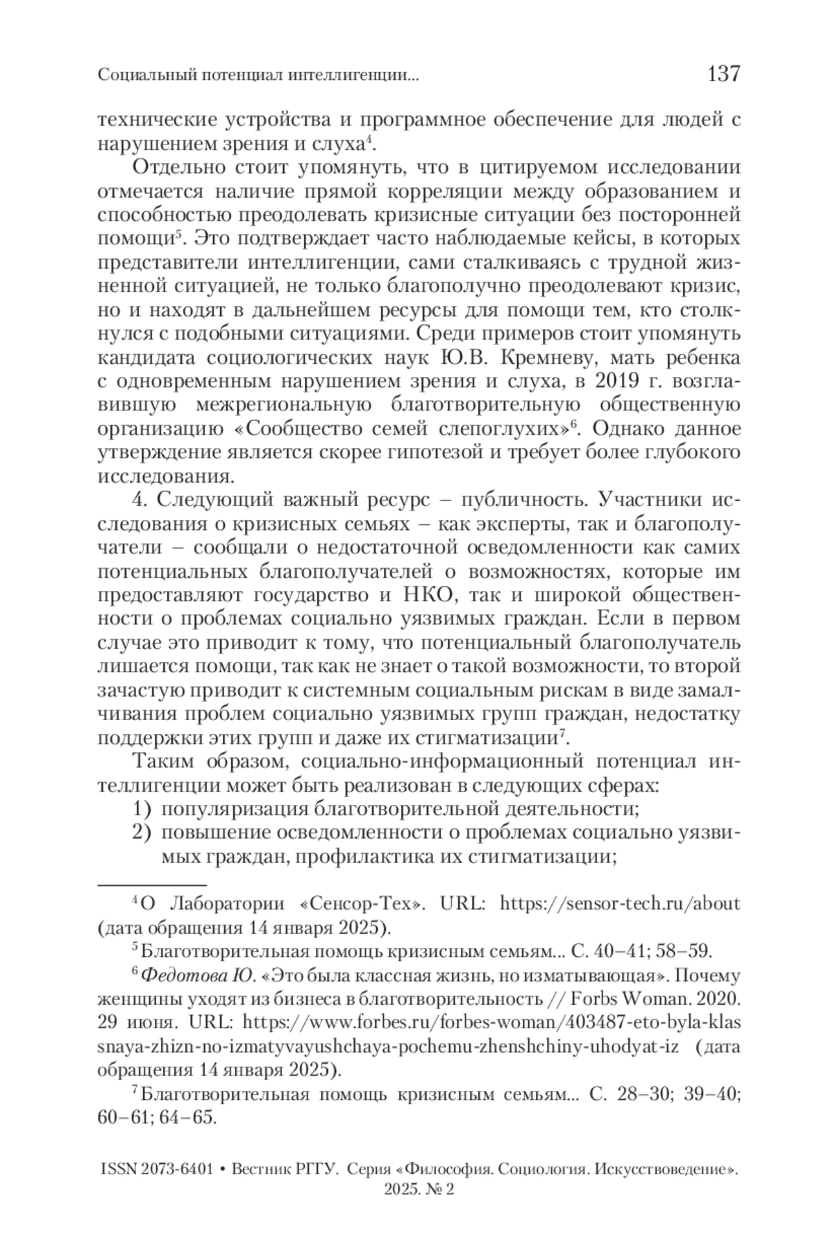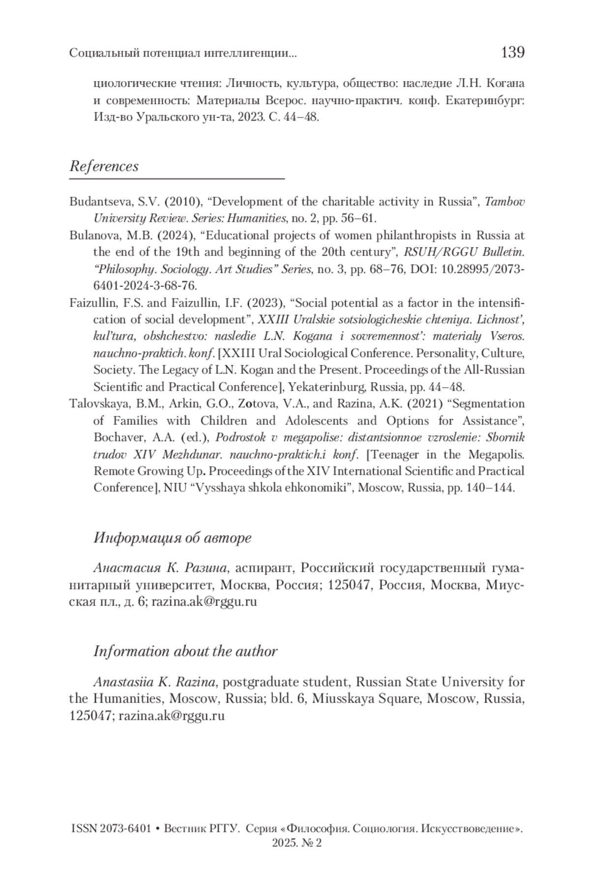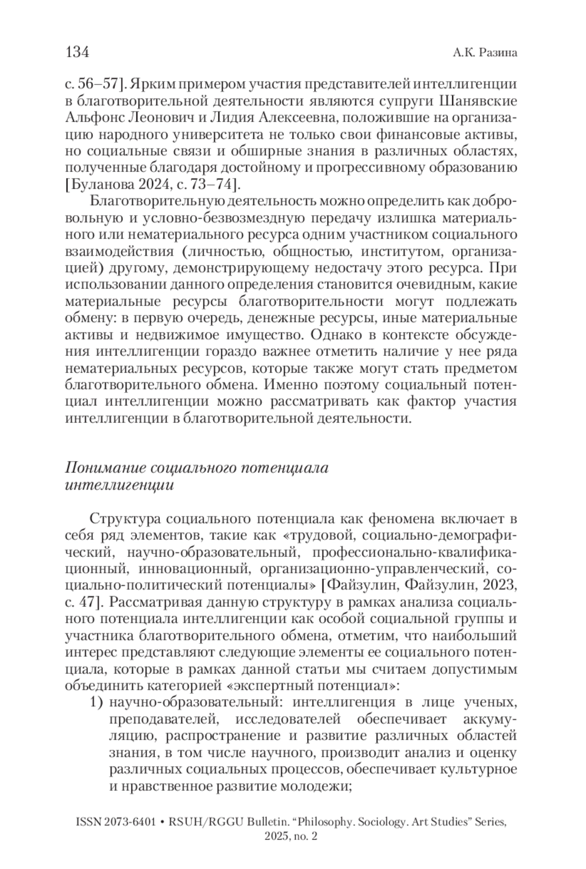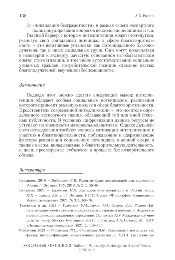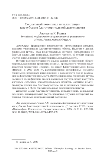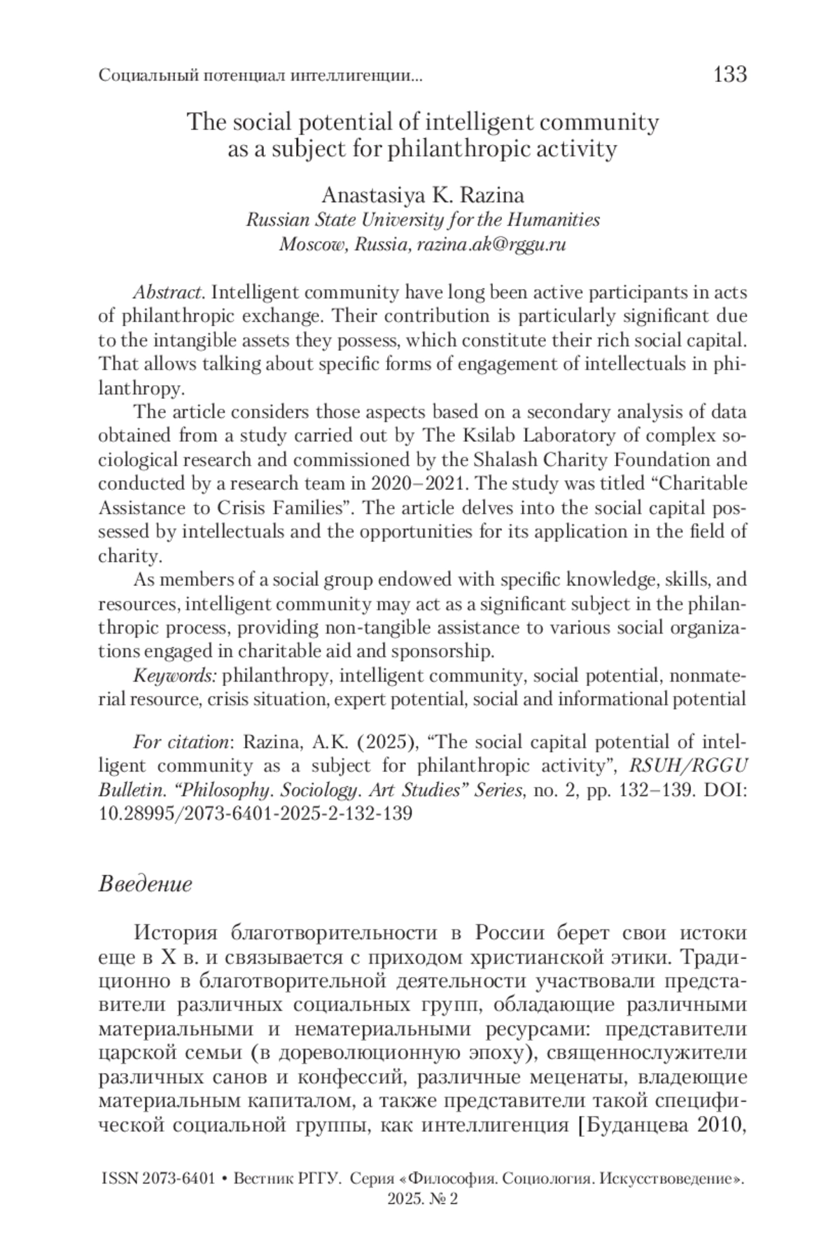 РАЗИНА А. К. СОЦИАЛЬНЫЙ ПОТЕНЦИАЛ ИНТЕЛЛИГЕНЦИИ КАК СУБЪЕКТА БЛАГОТВОРИТЕЛЬНОЙ ДЕЯТЕЛЬНОСТИ // ВЕСТНИК РГГУ. СЕРИЯ: ФИЛОСОФИЯ. СОЦИОЛОГИЯ. ИСКУССТВОВЕДЕНИЕ. 2025. № 2