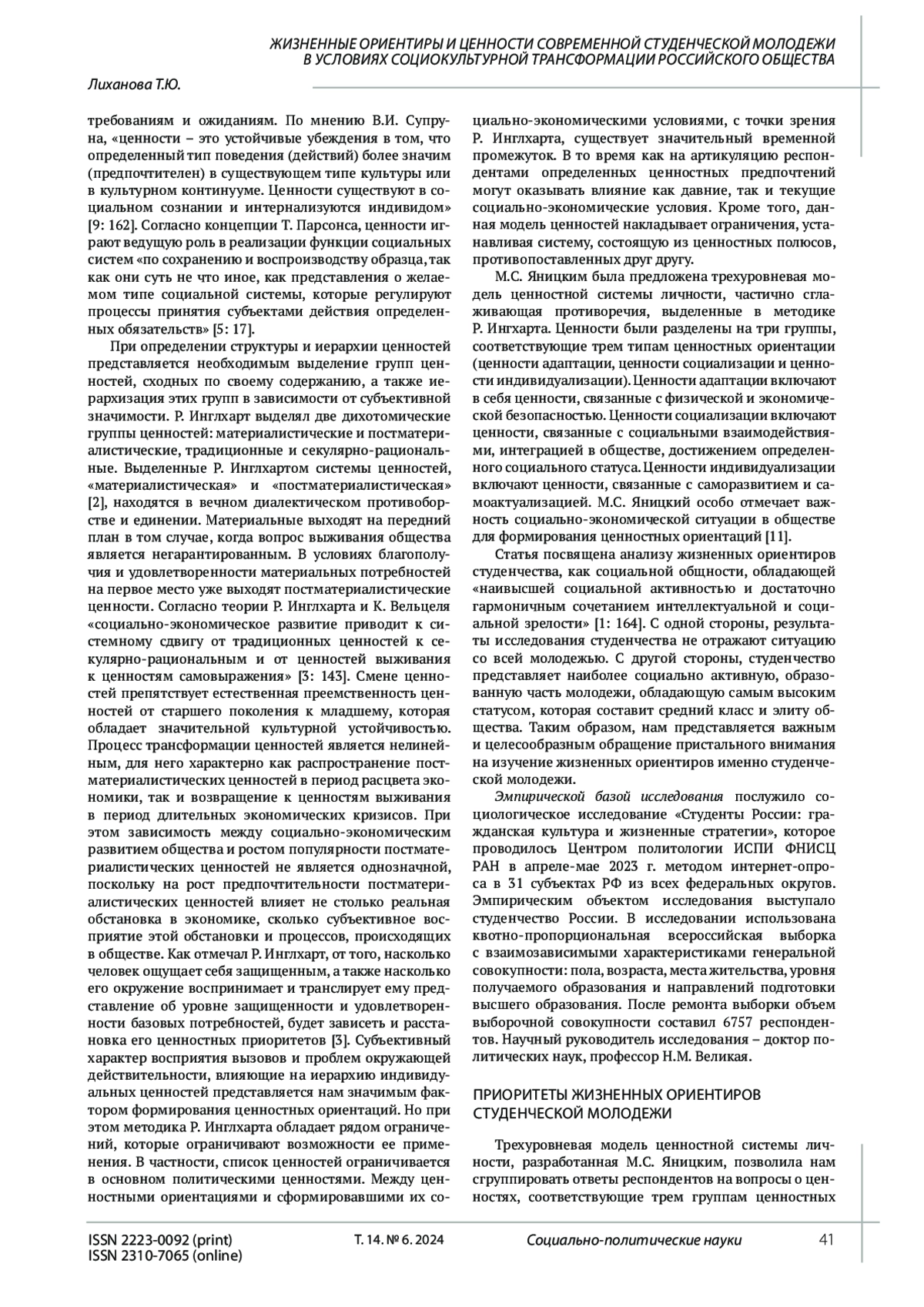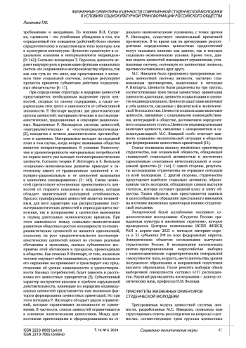 Изучение жизненных ориентиров студенчества важно для понимания процессов, происходящих в сознании молодого поколения, формирующегося под воздействием разных факторов и субъектов. Цель исследования - определить особенности и динамику жизненных ориентаций студенческой молодежи на основе их ценностных и целевых приоритетов. Результаты исследования жизненных ориентаций студенческой молодежи и их динамики продемонстрировали смещение ценностных приоритетов в сторону ценностей индивидуализации, а также укрепление позиций ценностей адаптации. Ценности социализации, связанные с социальным взаимодействием, интеграцией в обществе, отошли на второй план. Выход на первый план ценностей индивидуализации, с одной стороны, означает стабилизацию социально-экономической ситуации в стране, когда молодежь может сместить фокус внимания с ценностей, обеспечивающих выживание, на ценности самосовершенствования и самоактуализации. С другой стороны, приоритет ценностей индивидуализации знаменует культурно-ценностную трансформацию российского общества, риска межпоколенческого ценностного разрыва. Анализ динамики гендерных различий ценностных ориентаций указывает на трансформацию гендерных ролей, смещение традиционного для мужчин фокуса с адаптации на индивидуализацию, а также возрастание роли женщин в поддержании адаптационных механизмов.