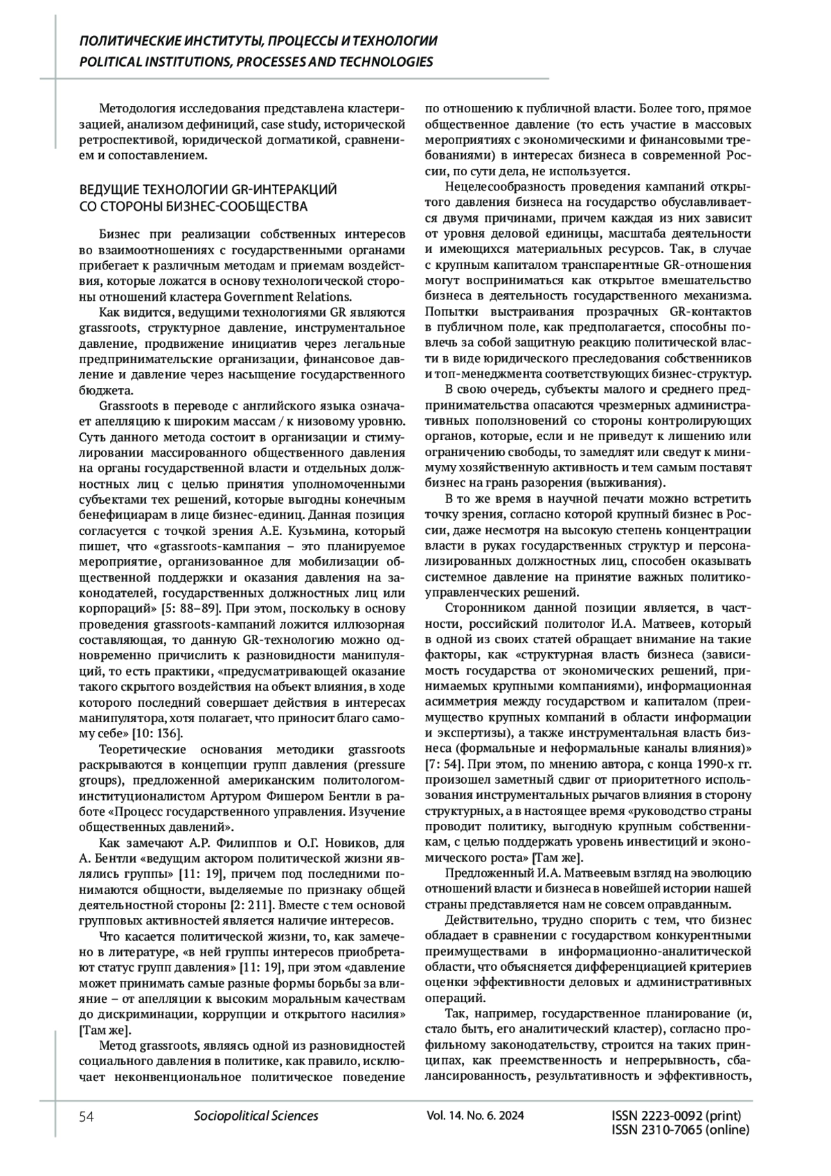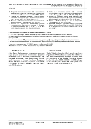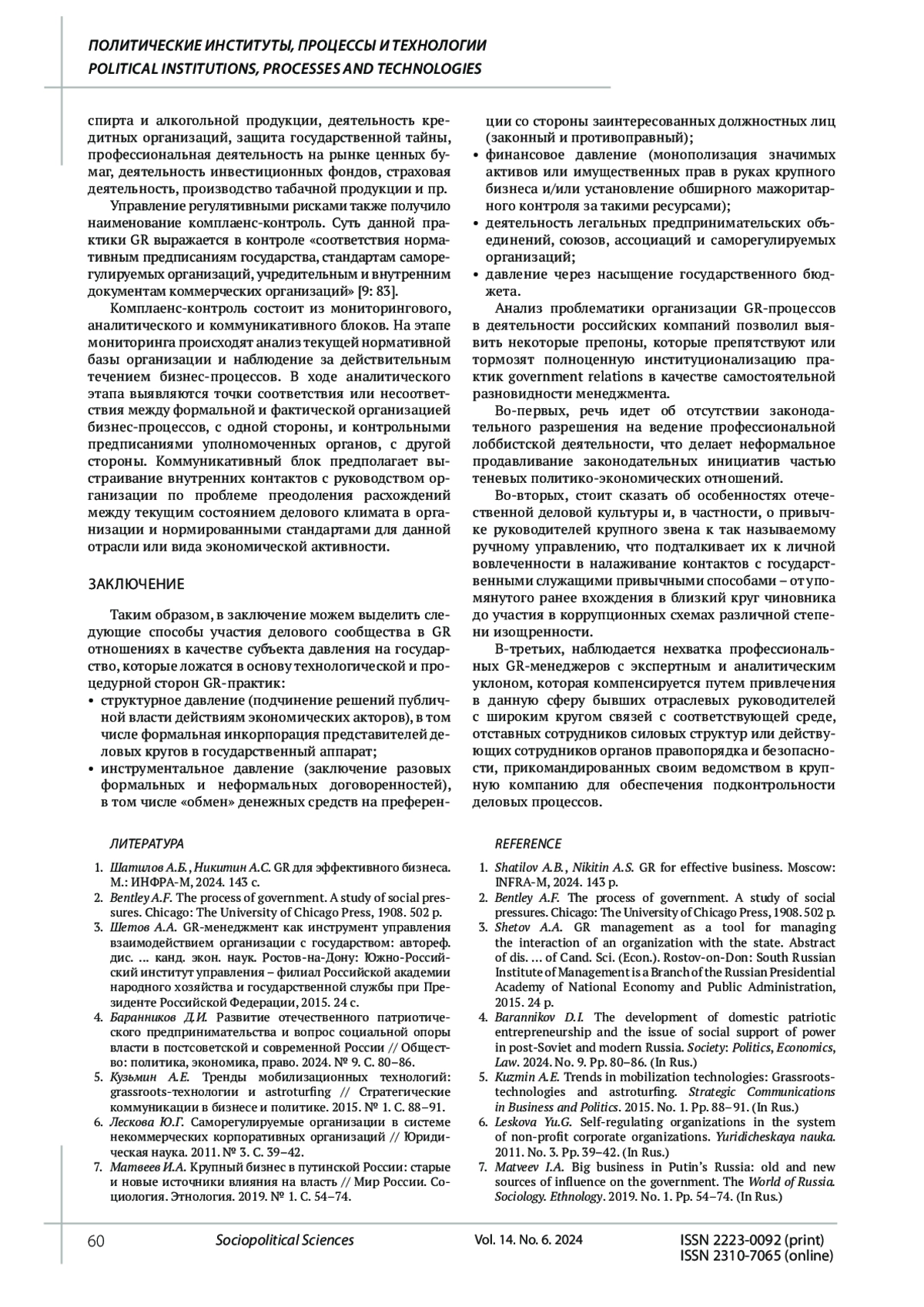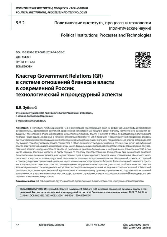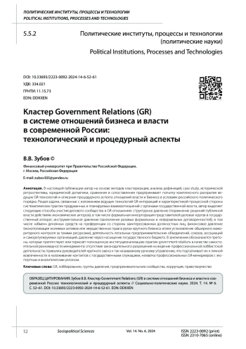 В настоящей публикации автор на основе методов кластеризации, анализа дефиниций, case study, исторической ретроспективы, юридической догматики, сравнения и сопоставления предпринимает попытку комплексного раскрытия ведущих GR-технологий и описания процедурного аспекта отношений власти и бизнеса в условиях российского политического порядка. Решая задачи, связанные с изложением ведущих технологий GR-интеракций и характеристикой процессной стороны систематических практик продуманных и планируемых взаимоотношений с органами государственной власти, автор выделяет следующие способы участия делового сообщества в GR-отношениях: структурное давление (подчинение решений публичной власти действиям экономических акторов), в том числе формальная инкорпорация представителей деловых кругов в государственный аппарат, инструментальное давление (заключение разовых формальных и неформальных договоренностей), в том числе «обмен» денежных средств на преференции со стороны заинтересованных должностных лиц, финансовое давление (монополизация значимых активов или имущественных прав в руках крупного бизнеса и/или установление обширного мажоритарного контроля за такими ресурсами), деятельность легальных предпринимательских объединений, союзов, ассоциаций и саморегулируемых организаций, давление через насыщение государственного бюджета. В заключении обозначаются препоны, которые препятствуют или тормозят полноценную институционализацию практик government relations в качестве самостоятельной разновидности менеджмента: отсутствие законодательного разрешения на ведение профессиональной лоббистской деятельности, привычка руководителей крупного звена к так называемому ручному управлению, что подталкивает их к личной вовлеченности в налаживание контактов с государственными служащими, нехватка профессиональных GR-менеджеров с экспертным и аналитическим уклоном.