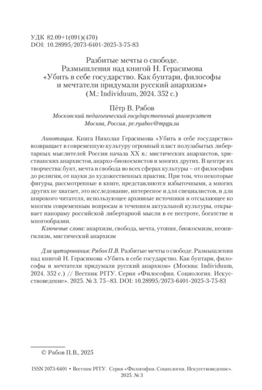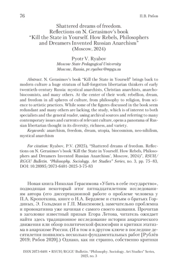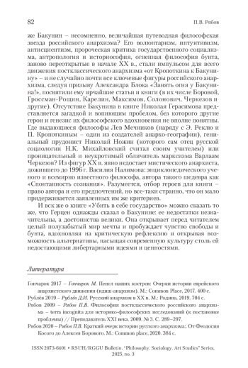 3. Рябов 2009 - Рябов П.В. Философия постклассического российского анархизма - terra incognita для историко-философских исследований (к постановке проблемы) // Преподаватель XXI века. 2009. № 3. С. 289-297.