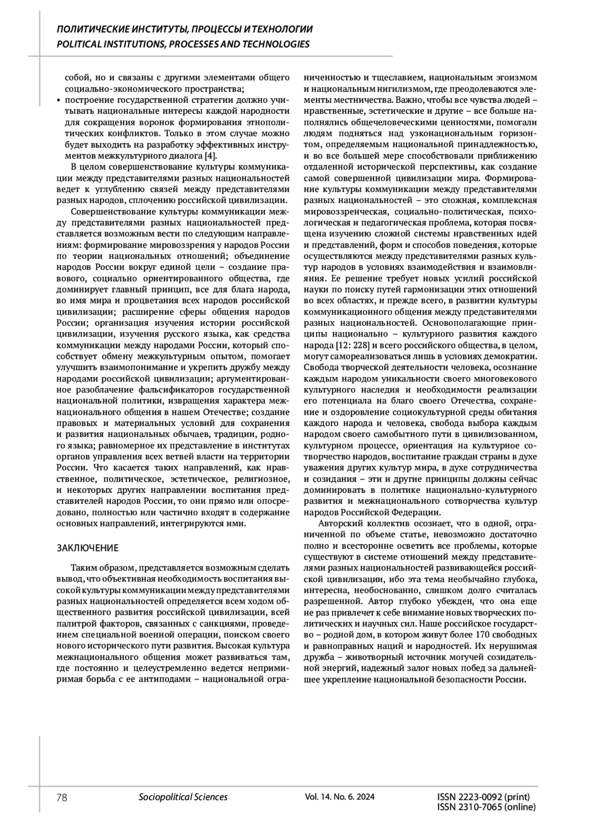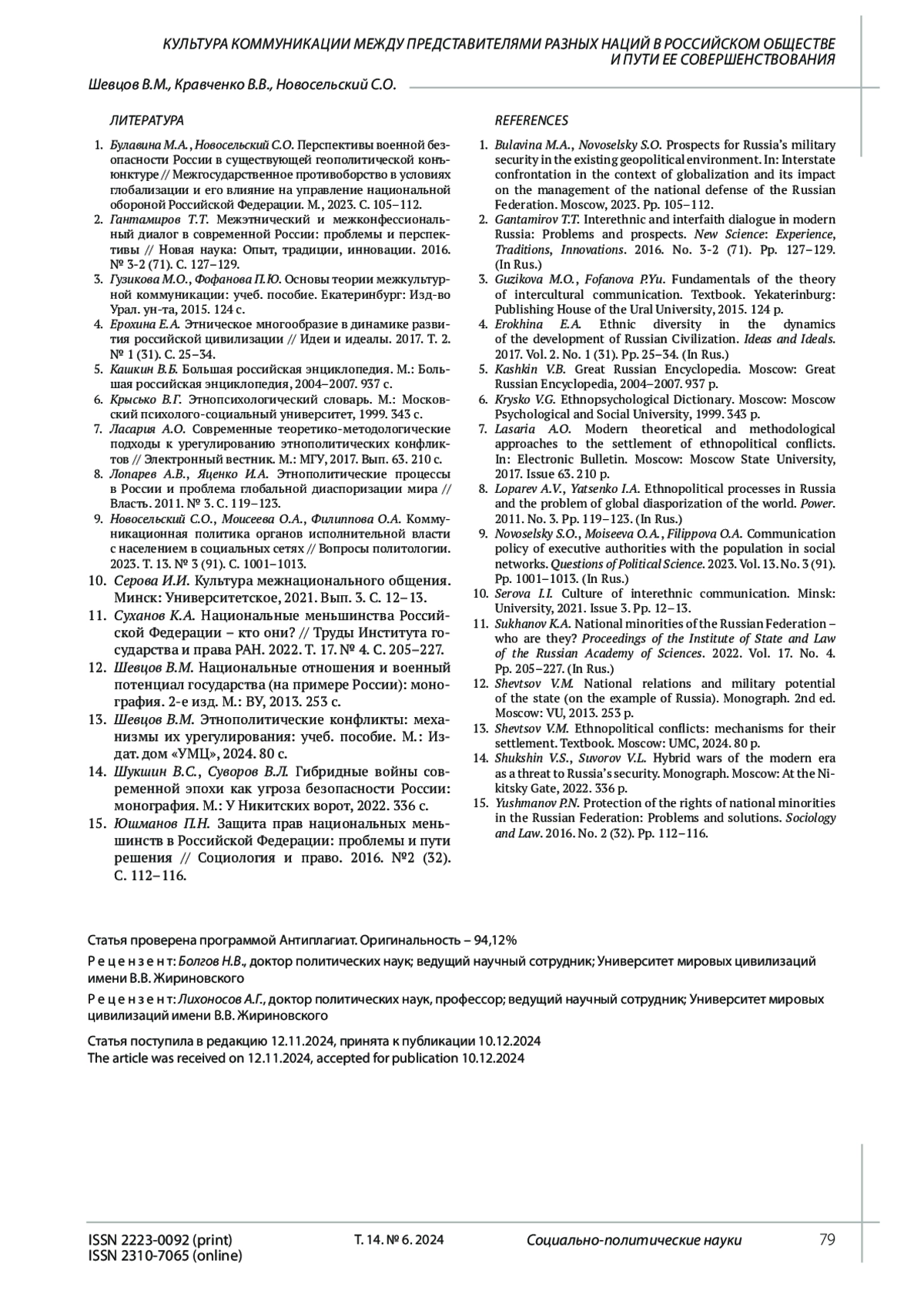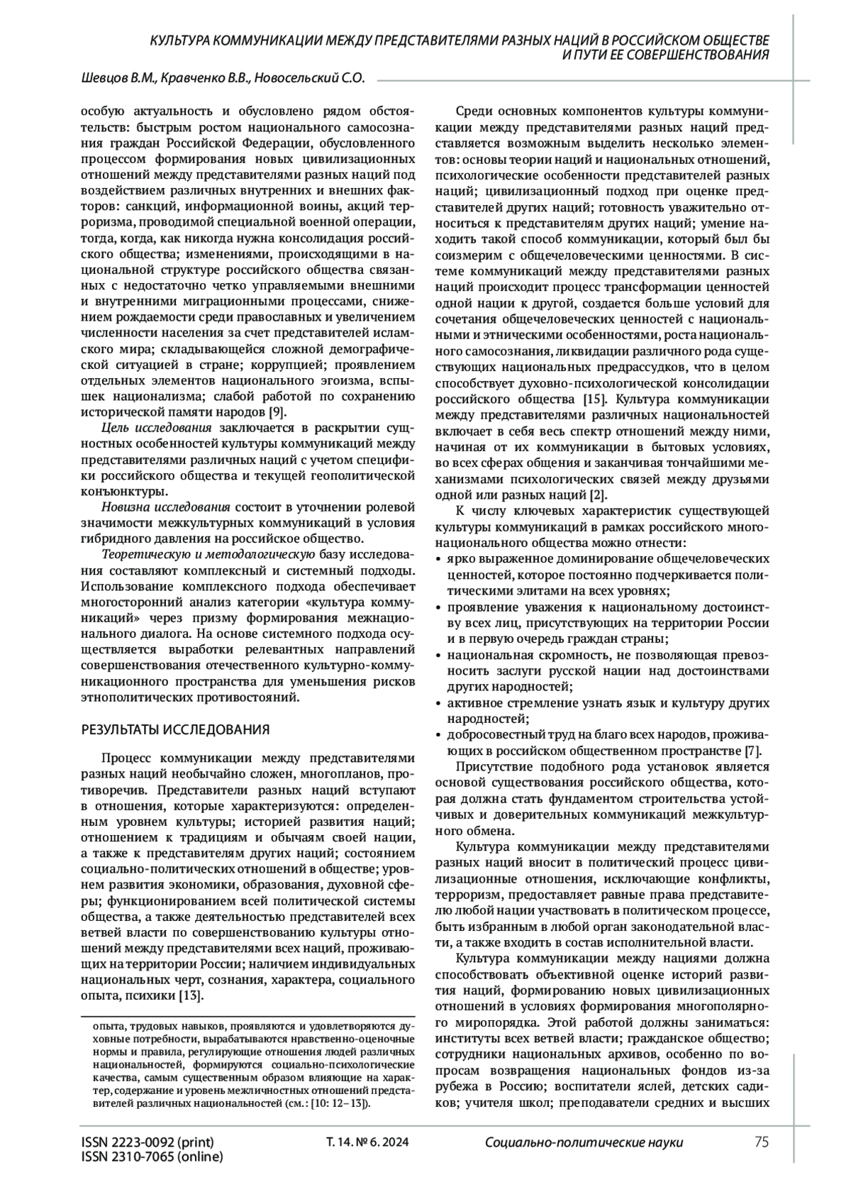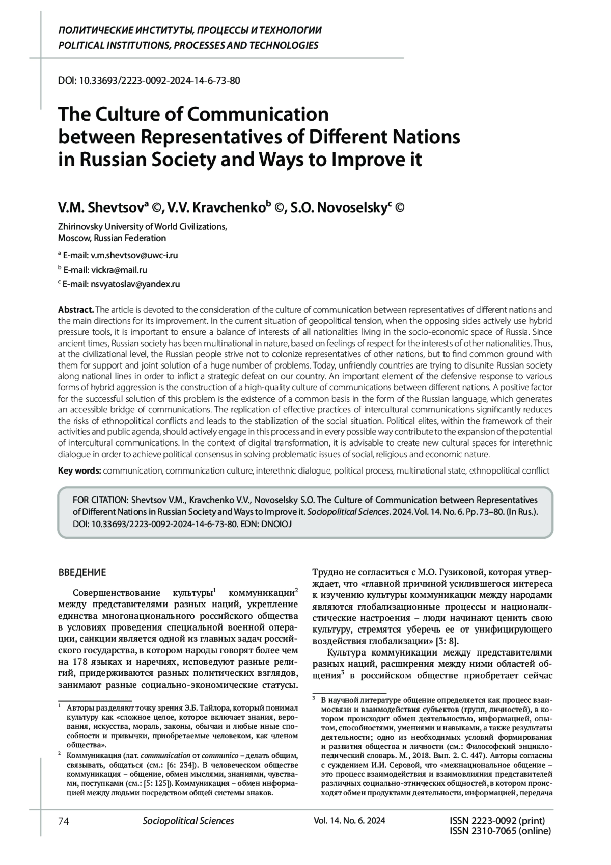 В статье рассматривается культура коммуникации между представителями разных наций и основные направления ее совершенствования. При существующей конъюнктуре геополитической напряженности, когда противоборствующие стороны максимально активно применяют инструменты гибридного давления, важно обеспечить баланс интересов всех народностей, проживающих в социально-экономическом пространстве России. Российское общество с древних времен носило многонациональный характер, в основе которого были положены чувства уважения к интересам других народностей. Таким образом, на цивилизационном уровне русский народ стремится не колонизировать представителей других наций, а найти с ними общие точки соприкосновения для поддержки и совместного решения огромного множества проблем. На сегодняшний день недружественные страны пытаются разобщить российское общество по национальному признаку с целью нанесения нашей стране стратегического поражения. Важным элементом оборонной реакции на различные формы гибридной агрессии является построение качественной культуры коммуникаций между различными нациями. Положительным фактором для успешного решения данной задачи выступает существование общего базиса в виде русского языка, который генерирует доступный мост коммуникаций. Тиражирование эффективных практик межкультурных коммуникаций заметно снижает риски этнополитических конфликтов и ведет к стабилизации общественной ситуации. Политические элиты в рамках своей деятельности и публичной повестки должны активно включаться в данный процесс и всячески способствовать расширению потенциала межкультурных коммуникаций. В условиях цифровой трансформации целесообразно создавать новые культурные пространства для межнационального диалога с целью достижения политического консенсуса при решении проблемных вопросов социального, религиозного и экономического характеров.