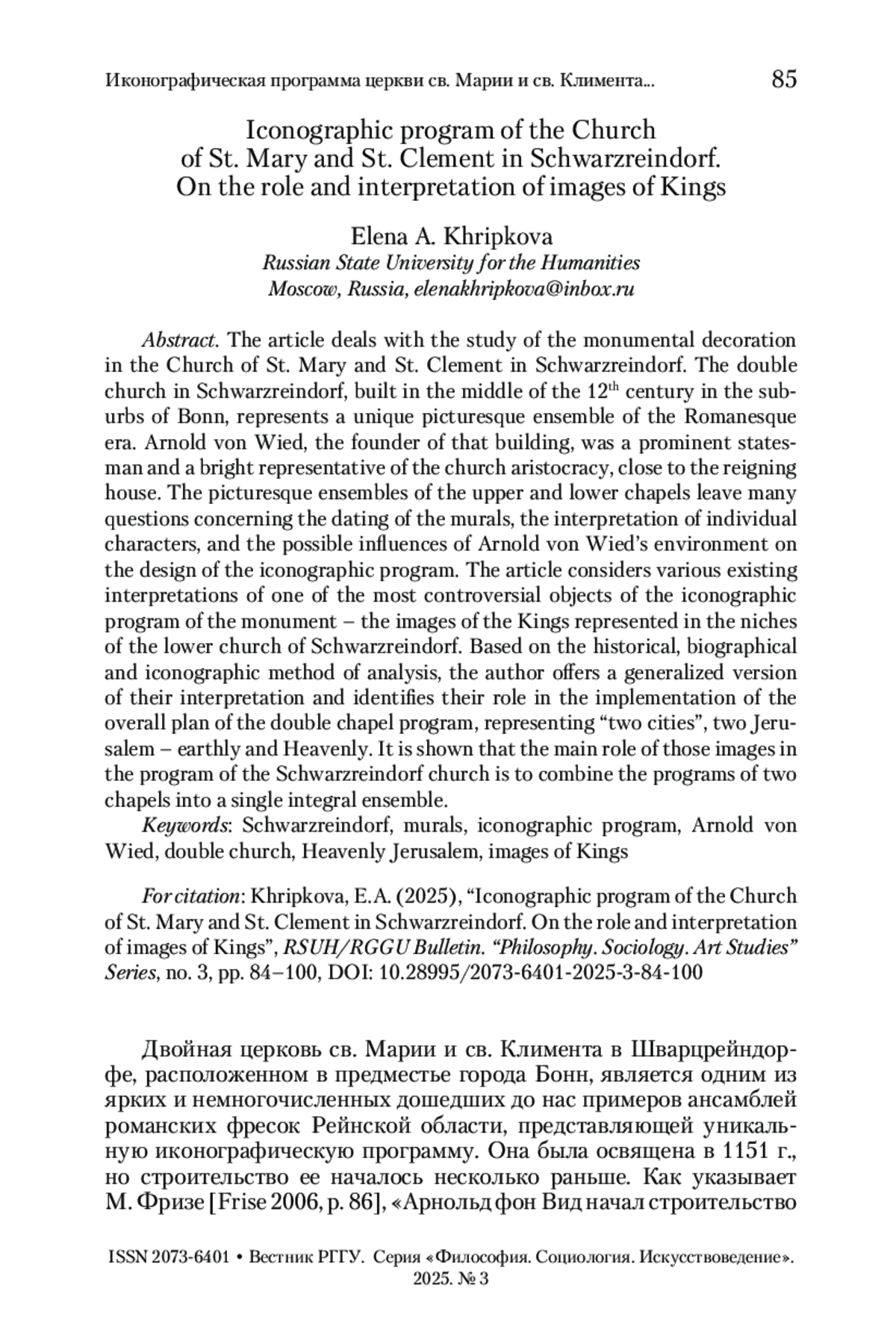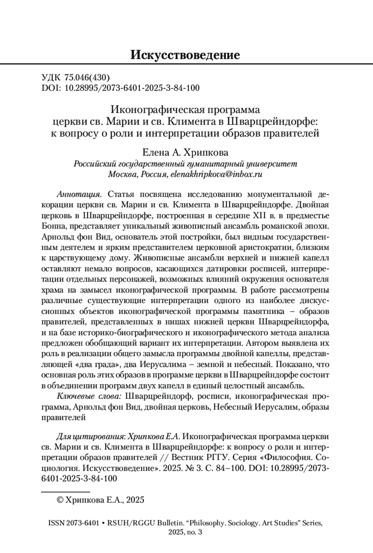 Статья посвящена исследованию монументальной декорации церкви св. Марии и св. Климента в Шварцрейндорфе. Двойная церковь в Шварцрейндорфе, построенная в середине XII в. в предместье Бонна, представляет уникальный живописный ансамбль романской эпохи. Арнольд фон Вид, основатель этой постройки, был видным государственным деятелем и ярким представителем церковной аристократии, близким к царствующему дому. Живописные ансамбли верхней и нижней капелл оставляют немало вопросов, касающихся датировки росписей, интерпретации отдельных персонажей, возможных влияний окружения основателя храма на замысел иконографической программы. В работе рассмотрены различные существующие интерпретации одного из наиболее дискуссионных объектов иконографической программы памятника – образов правителей, представленных в нишах нижней церкви Шварцрейндорфа, и на базе историко-биографического и иконографического метода анализа предложен обобщающий вариант их интерпретации. Автором выявлена их роль в реализации общего замысла программы двойной капеллы, представляющей «два града», два Иерусалима – земной и небесный. Показано, что основная роль этих образов в программе церкви в Шварцрейндорфе состоит в объединении программ двух капелл в единый целостный ансамбль.