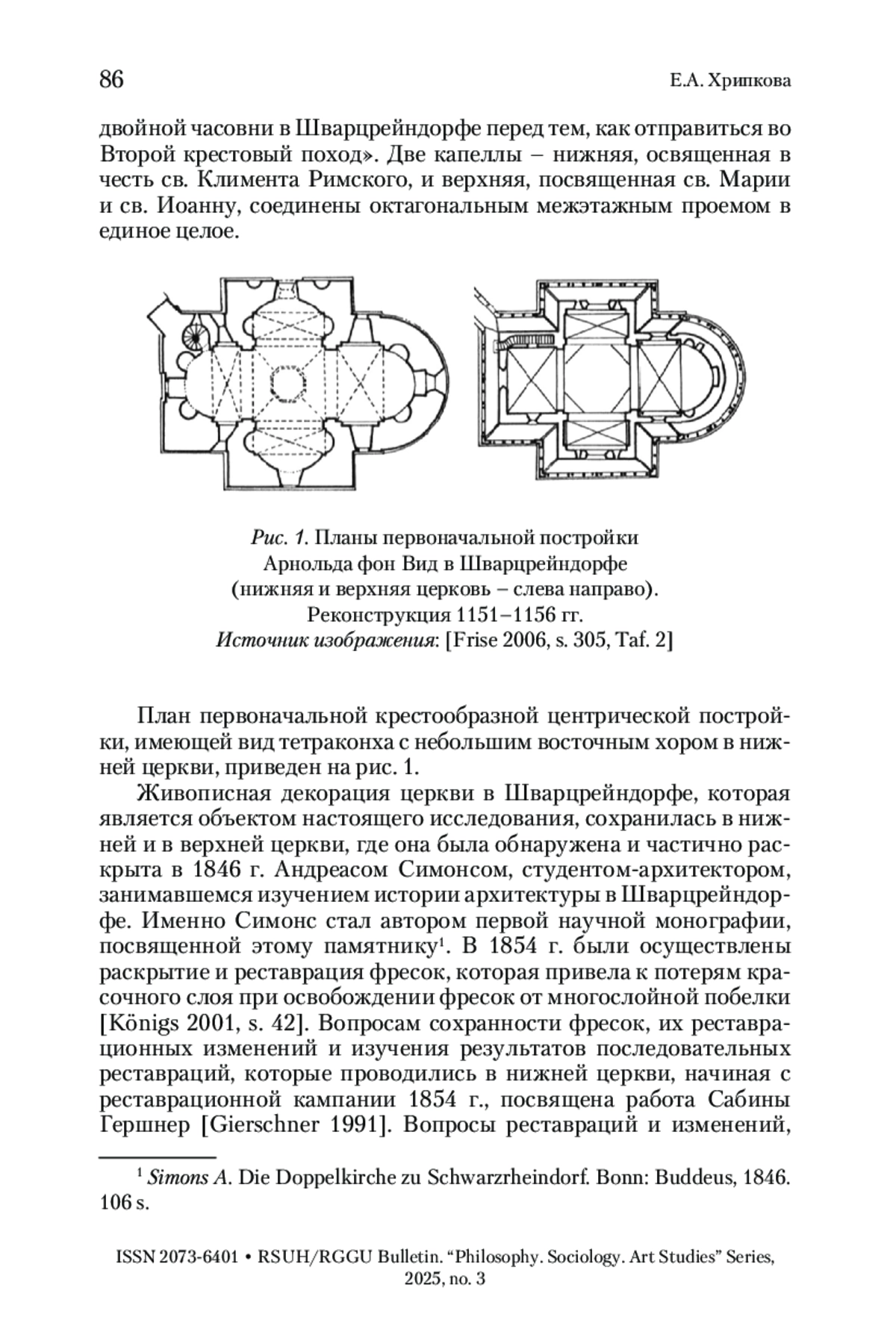 3. Хрипкова 2018 - Хрипкова Е.А. Культ «пустого трона» и идея единства светской и церковной власти в программе церкви св. Марии и св. Климента в Шварцрейндорфе // Артикульт. 2018. № 32 (4). C. 43-55.