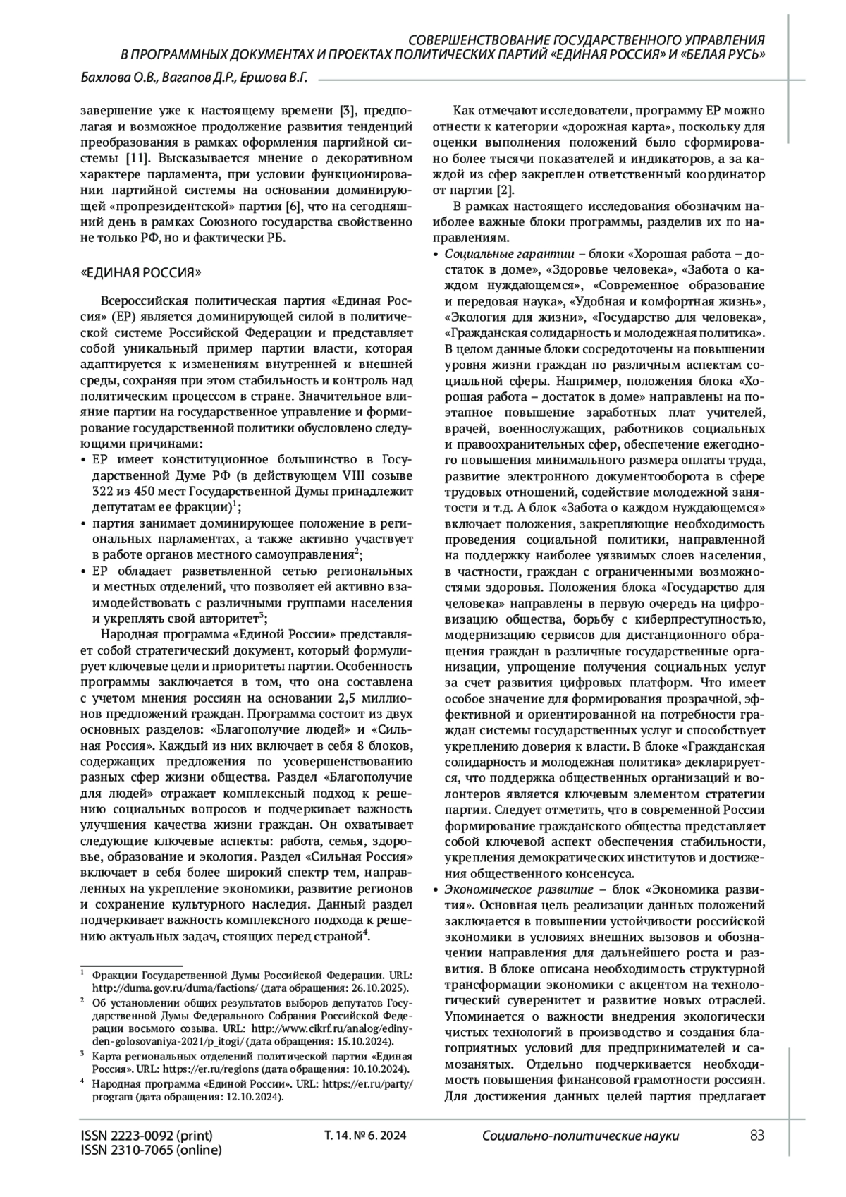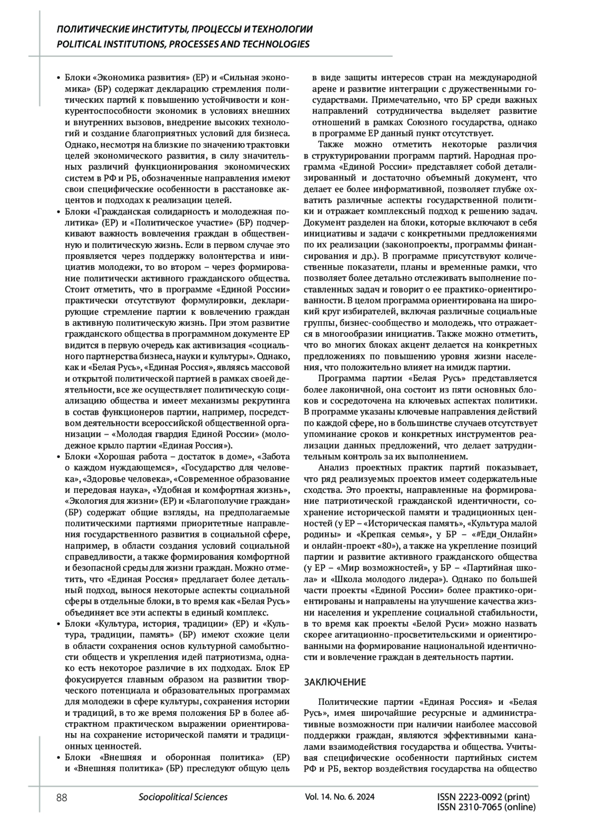 Целью статьи является выявление сходств и различий в артикуляции программных положений и реализации проектных практик крупнейших политических партий государств-участников Союзного государства Беларуси и России, «Белой Руси» и «Единой России». Выявляется значение ролей исследуемых партий в контексте формирования направлений развития государственного управления и гражданского общества. Подчеркивается сближение контуров формальной организации партийных систем Российской Федерации и Республики Беларусь при условии сохранения специфических механизмов политического участия граждан, свойственных политическим системам государств. Делаются выводы о сходстве сущностных параллелей в постулируемых обеими партиями установках относительно приверженности пути суверенного и независимого развития государств с сохранением самобытности традиционных ценностей и основ культуры, открытости к конструктивному сотрудничеству по отношению к дружественно настроенным государствам, упрочнения информационного и технологического суверенитета. Анализ проектных практик партий позволил сделать выводы о наличии содержательных сходств и различий в рамках ряда проектов, направленных на коммуникацию государства и общества с целью укрепления предпосылок формирования гражданской патриотической идентичности. Особое внимание уделяется статусу анализируемых партий в общей структуре партийных систем России и Беларуси.