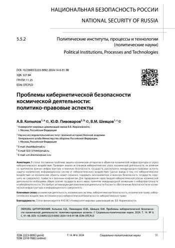 10. Розенцвайг А.И., Коныгин Р.А. Обеспечение кибербезопасности в космическом пространстве // Вопросы российского и международного права. 2019. Т. 9. № 11-1. С. 170-178. EDN: GQBVOH
