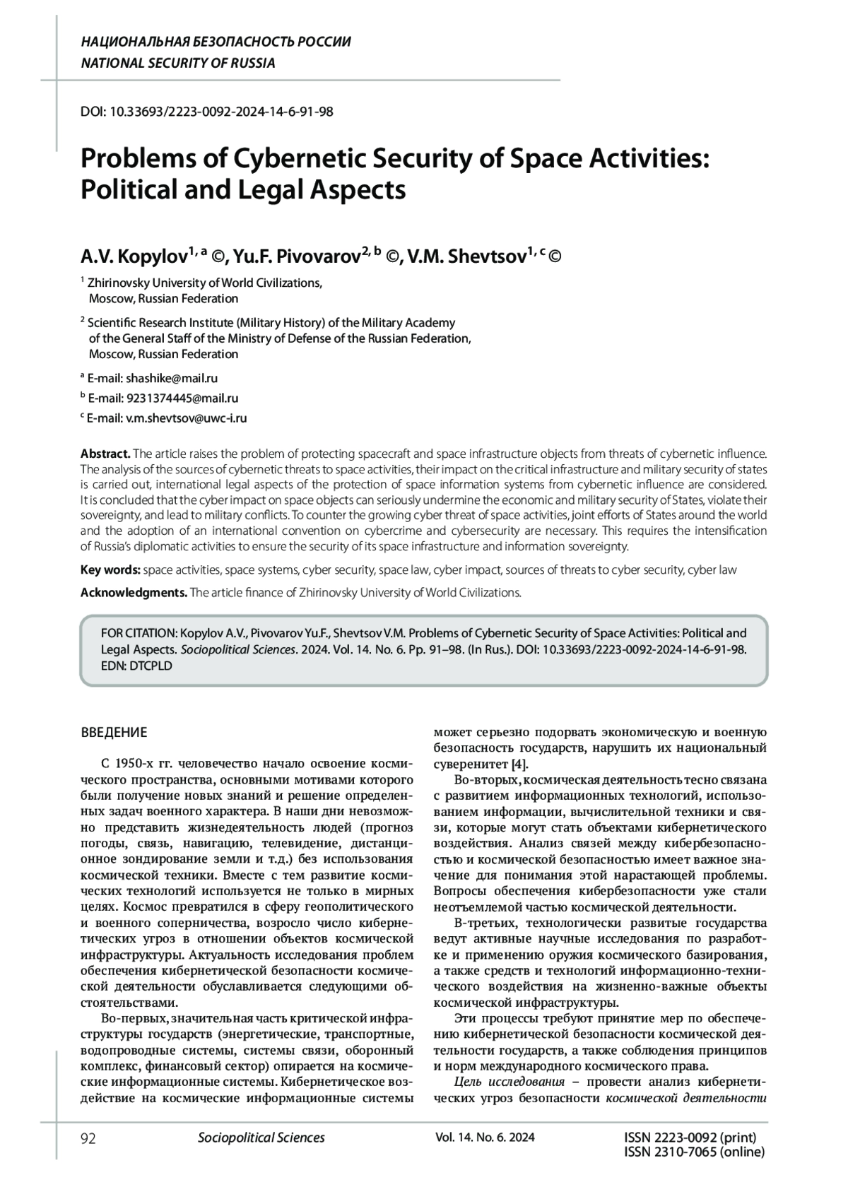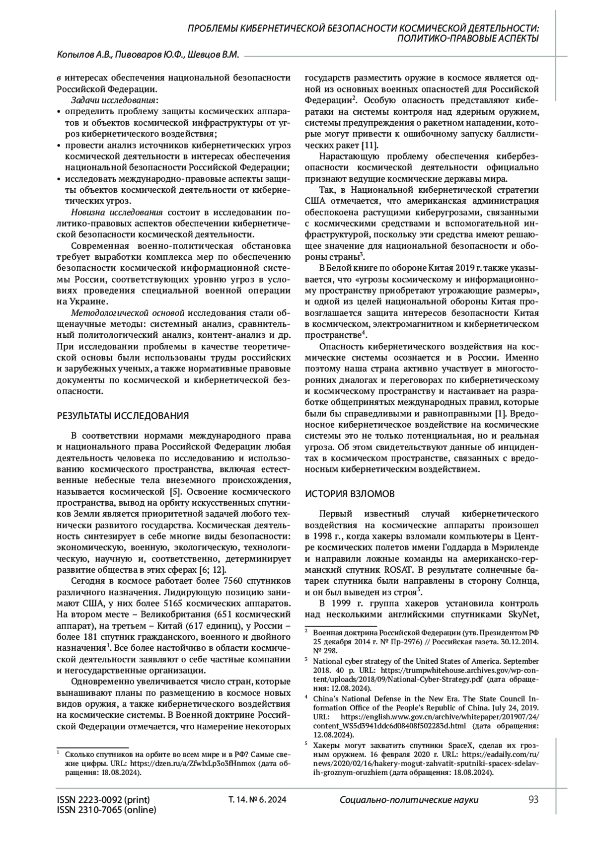 6. Иншаков С.М. Космическая безопасность: системный анализ // Вопросы безопасности. 2019. № 6. EDN: ERUVID