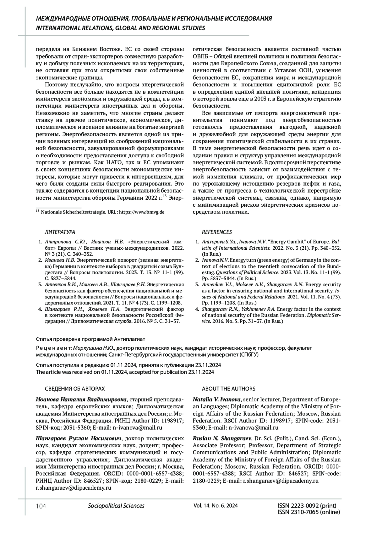 4. Шангараев Р.Н., Яхменев П.А. Энергетический фактор в контексте национальной безопасности Российской Федерации // Дипломатическая служба. 2016. № 5. С. 31-37. EDN: XBDGJR