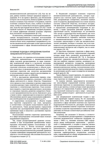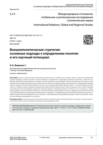 Анализ и изучение внешнеполитической деятельности в современных условиях связаны с широким плюрализмом научных подходов, в рамках которых основное внимание сосредоточено на факторах различного характера, а также многообразием трактовок распространенных ключевых понятий, одним из которых является «внешнеполитическая стратегия». Анализ практики использования понятия «внешнеполитическая стратегия» позволяет выявить два подхода к его определению. В рамках первого подхода стратегия рассматривается как план или концепция действий, в рамках второго - как целенаправленная деятельность. В рамках второго подхода, который представляется более продуктивным и перспективным, а также соответствующим отечественной научной традиции, предложен авторский вариант определения данного понятия и его соотношения с такими дефинициями как «внешнеполитический курс», «внешнеполитическая программа». Основное содержание внешнеполитической стратегии раскрывается посредством категорий «цели» и средства», что предоставляет дополнительные возможности для исследования внешнеполитической деятельности, описания и классификации ее разнообразных форм, а также способствует снижению многообразия дефиниций и их трактовок.