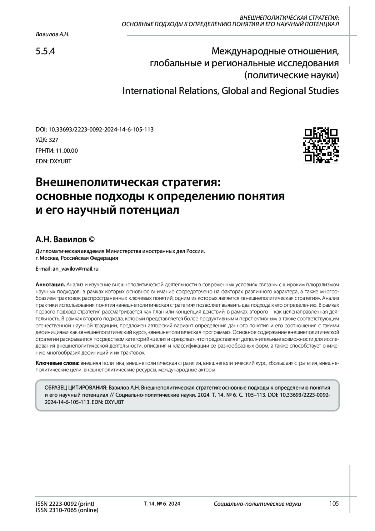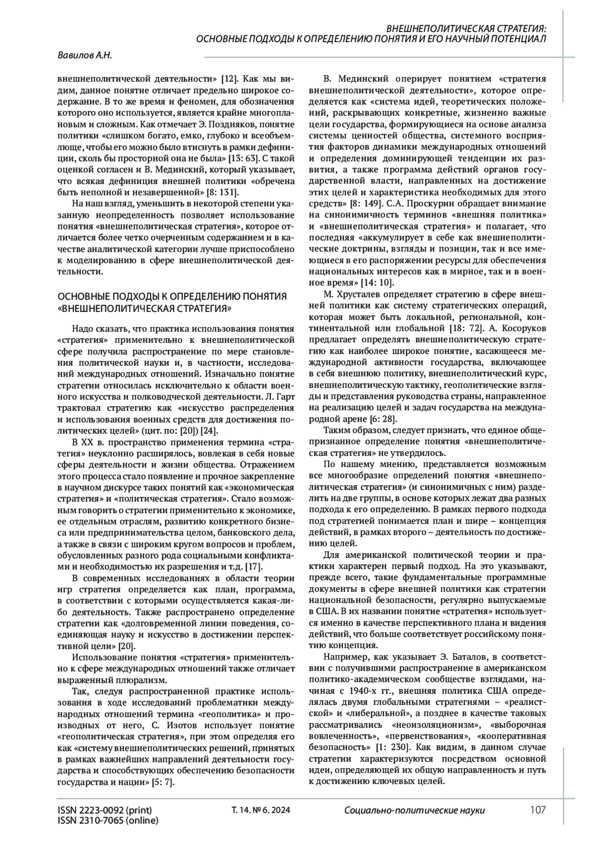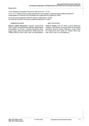 6. Косоруков А.А. Внешнеполитическая стратегия современного государства: соотношение глобального и национального: монография. М.: МАКС Пресс, 2016. EDN: VVLFUV