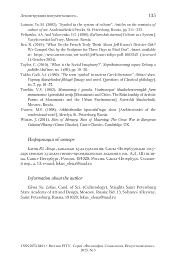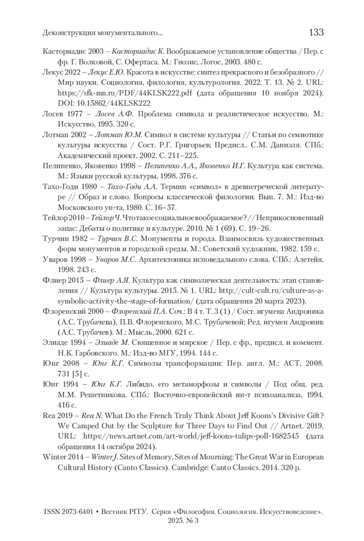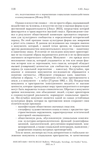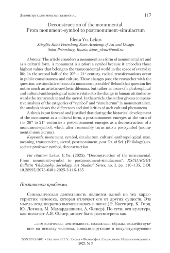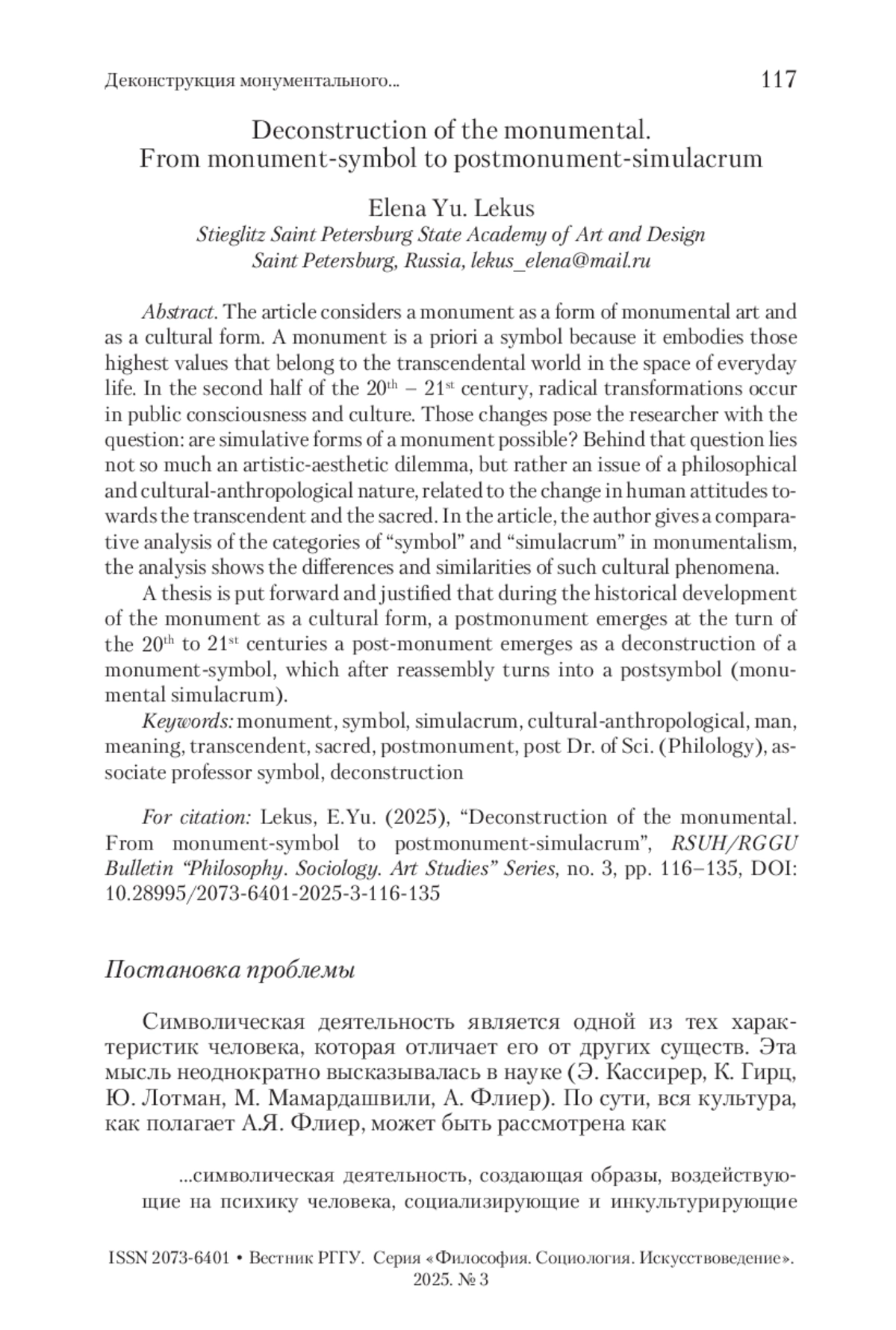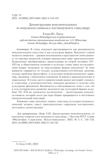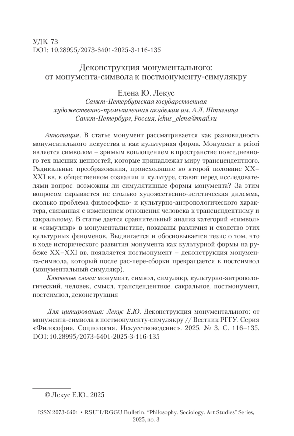 ЛЕКУС Е. Ю. ДЕКОНСТРУКЦИЯ МОНУМЕНТАЛЬНОГО: ОТ МОНУМЕНТА-СИМВОЛА К ПОСТМОНУМЕНТУ-СИМУЛЯКРУ // ВЕСТНИК РГГУ. СЕРИЯ: ФИЛОСОФИЯ. СОЦИОЛОГИЯ. ИСКУССТВОВЕДЕНИЕ. 2025. № 3