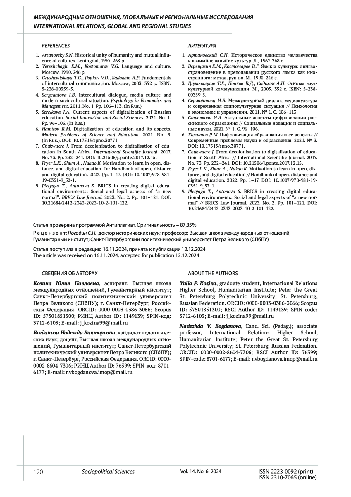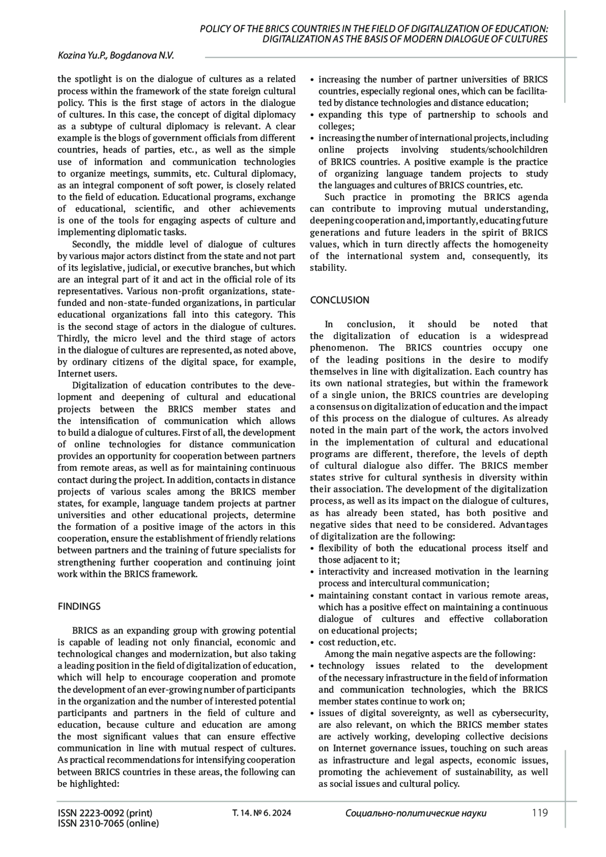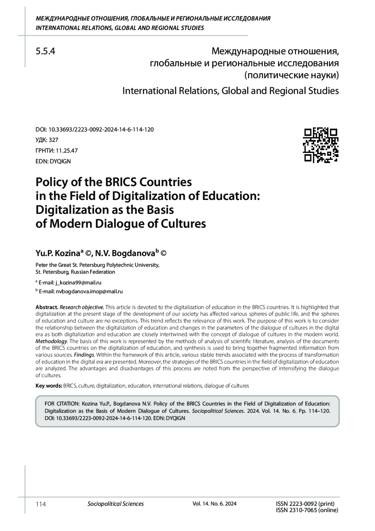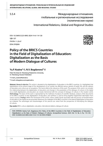 КОЗИНА Ю. П., БОГДАНОВА Н. В. ПОЛИТИКА СТРАН БРИКС В ОБЛАСТИ ЦИФРОВИЗАЦИИ ОБРАЗОВАНИЯ: ЦИФРОВИЗАЦИЯ КАК ОСНОВА СОВРЕМЕННОГО ДИАЛОГА КУЛЬТУР // СОЦИАЛЬНО-ПОЛИТИЧЕСКИЕ НАУКИ. 2024. Т. 14 № 6