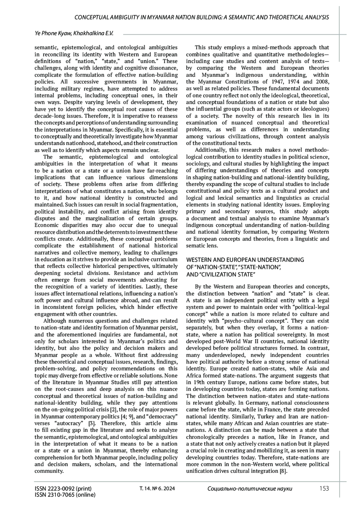 ХАХАЛКИНА Е. В. КОНЦЕПТУАЛЬНОЕ ПРОТИВОРЕЧИЕ В ГОСУДАРСТВЕННОМ СТРОИТЕЛЬСТВЕ МЬЯНМЫ: СМЫСЛОВОЙ И ТЕОРЕТИЧЕСКИЙ АНАЛИЗ // СОЦИАЛЬНО-ПОЛИТИЧЕСКИЕ НАУКИ. 2024. Т. 14 № 6