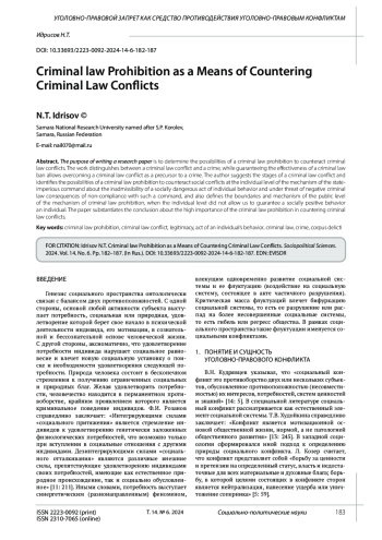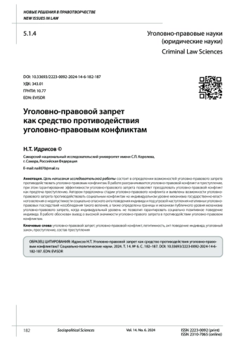Цель написания исследовательской работы состоит в определении возможностей уголовно-правового запрета противодействовать уголовно-правовым конфликтам. В работе разграничивается уголовно-правовой конфликт и преступление, при этом гарантирование эффективности уголовно-правового запрета позволяет преодолевать уголовно-правовой конфликт как предтеча преступлению. Автором предложены стадии уголовно-правового конфликта и выявлены возможности уголовно-правового запрета противодействовать социальным конфликтам на индивидуальном уровне механизма государственно-властного веления о недопустимости социально опасного акта поведения индивида и под угрозой наступления негативных уголовно-правовых последствий несоблюдения такого веления, а также определены границы и механизм публичного уровня механизма уголовно-правового запрета, когда индивидуальный уровень не позволил гарантировать социально позитивное поведение индивида. В работе обоснован вывод о высокой значимости уголовно-правого запрета в противодействии уголовно-правовом конфликтам.