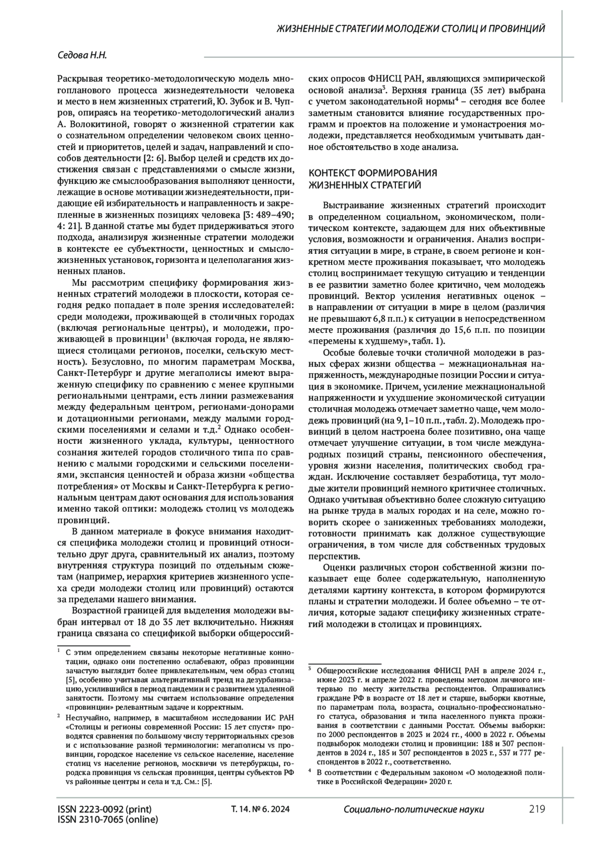 Последнее десятилетие, и особенно период с 2022 г., стали для России и ее граждан временем переоценки ценностей, уточнения смыслов в развитии страны и в жизни каждого отдельного человека. В условиях глобального геополитического кризиса и неопределенности не только отдаленных, но и ближайших перспектив, усложняется процесс выстраивания человеком собственных жизненных стратегий.