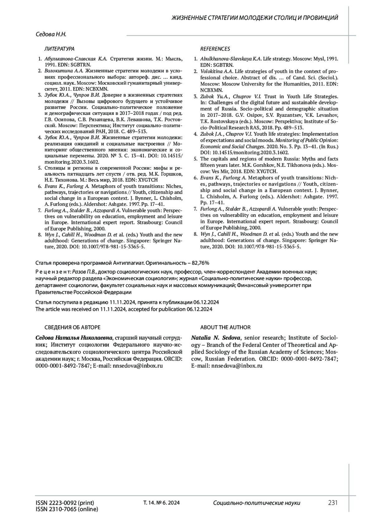 4. Зубок Ю.А., Чупров В.И. Жизненные стратегии молодежи: реализация ожиданий и социальные настроения // Мониторинг общественного мнения: экономические и социальные перемены. 2020. № 3. С. 13-41. DOI: 10.14515/monitoring.2020.3.1602 EDN: GTXODD