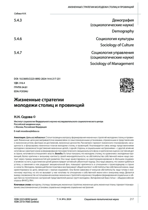 Цель исследования. Статья посвящена вопросу формирования жизненных стратегий молодежи столиц и провинций. Жизненные цели рассматриваются во взаимосвязи со смысложизненными установками, отраженными в представлениях о жизненном успехе, факторах их достижения, жизненных ценностях. Рассмотрен горизонт жизненного планирования, насыщенность и фокусировка жизненных планов молодежи столиц и провинций. Анализируется связь между представлениями молодежи о возможности достижения жизненных целей, с одной стороны, и социальными настроениями - с другой; влияние негативных самопрогнозов на формирование пессимистического эмоционального фона и критических оценок состояния дел в стране, негативного отношения к власти. Выводы. В статье показано, что молодежь столиц, по сравнению с молодежью провинций, более критична к внешнему контексту своей жизнедеятельности; на обстоятельства собственной жизни чаще смотрит через призму возможностей для развития. Она чаще ориентирована на самопозиционирование в «большом социуме» и влияние на него, в достижении целей демонстрирует активный субъектный подход. Она чаще уверена, что сможет добиться успеха, а сомнения в нем ухудшают эмоциональный фон, повышают критичность в отношении к происходящему в стране и к власти. Молодежь провинций более позитивно воспринимает общий контекст и обстоятельства собственной жизни, чаще ориентирована на цели, связанные с «малым социумом». Она более зависима от внешних обстоятельств, чаще готова к жизненному неуспеху, но это не вызывает у нее негатива по отношению к собственной жизни или к внешнему миру. Делается вывод о возможностях использования анализа жизненных стратегий в изучении специфики формирования социальных и общественно-политических настроений представителей разных групп молодежи. Эмпирическая база статьи - общероссийские опросы ФНИСЦ РАН.