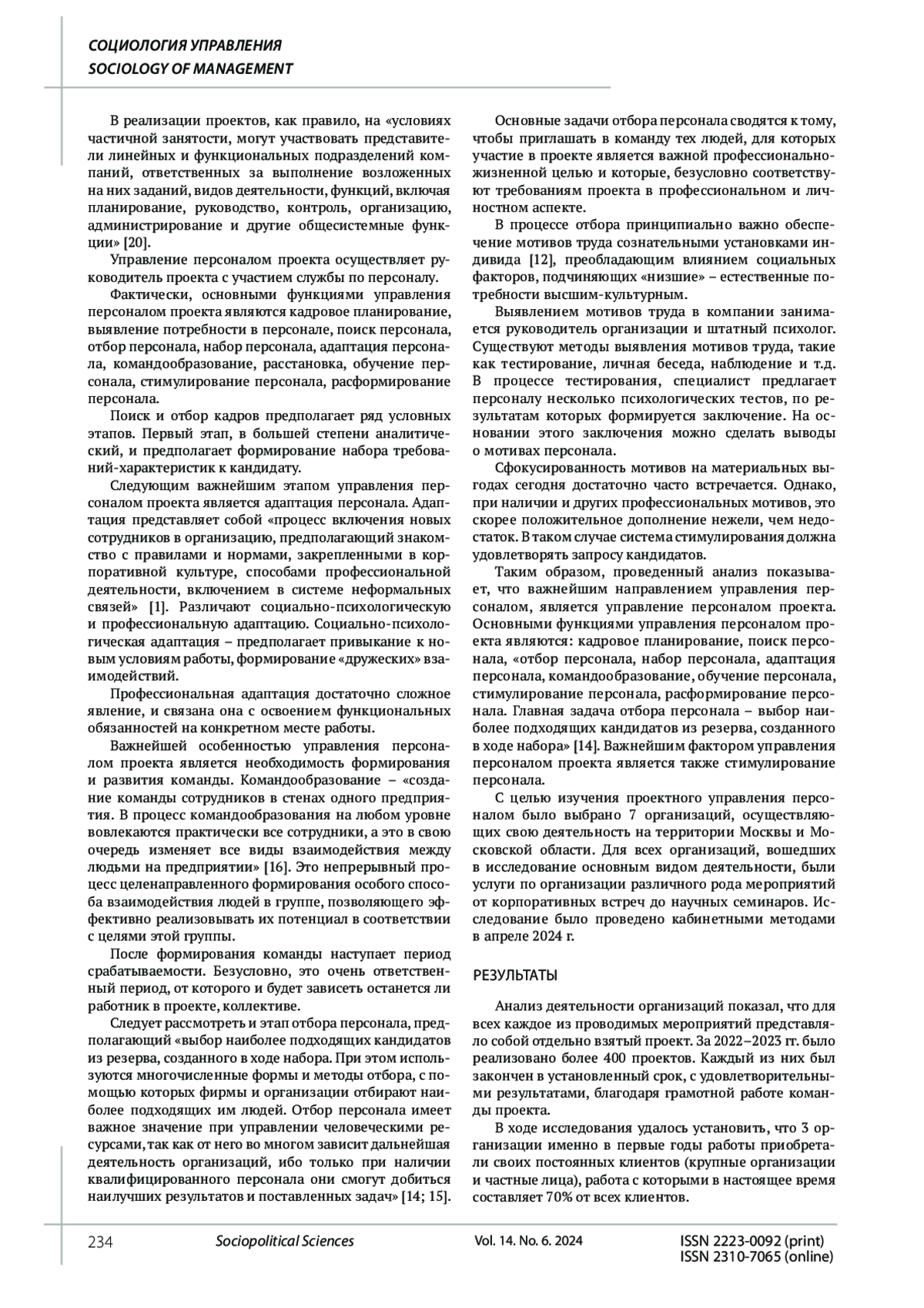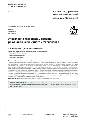 В статье обосновывается необходимость комплексного исследования процессов, связанных с управлением персоналом при реализации проектов. Авторы определяют основные теоретико-методологические подходы, которые эвристичны для проблематики управления персоналом проекта (В. Г. Асеев, П. В. Вейл, А. П. Волгин, В. М. Матирко, В. И. Воропаев, М. Р. Вудкок, И. Н. Герчикова, В. К. Гупалов, А. А. Демченко, Г. Д. Дитхелм). Раскрываются основные этапы подбора и отбора персонала, определяется их специфика. Приводятся результаты кабинетного исследования, проведенного в апреле 2024 среди организаций, реализующих проекты различной направленности в сфере организации мероприятий. Анализ результатов проведенного исследования показывает специфику управления персоналом, занятого в проекте, обозначает ряд проблемных мест. В качестве рекомендаций по разрешению существующих трудностей предлагается комплекс мероприятий, включающий в себя организацию системы непрерывного обучения руководителей, введения в штат организации должности психолога, усовершенствования системы стимулирования. Внедрение представленных рекомендаций будет способствовать повышению конкурентоспособности организаций на рынке услуг, и их экономической и социальной эффективности.