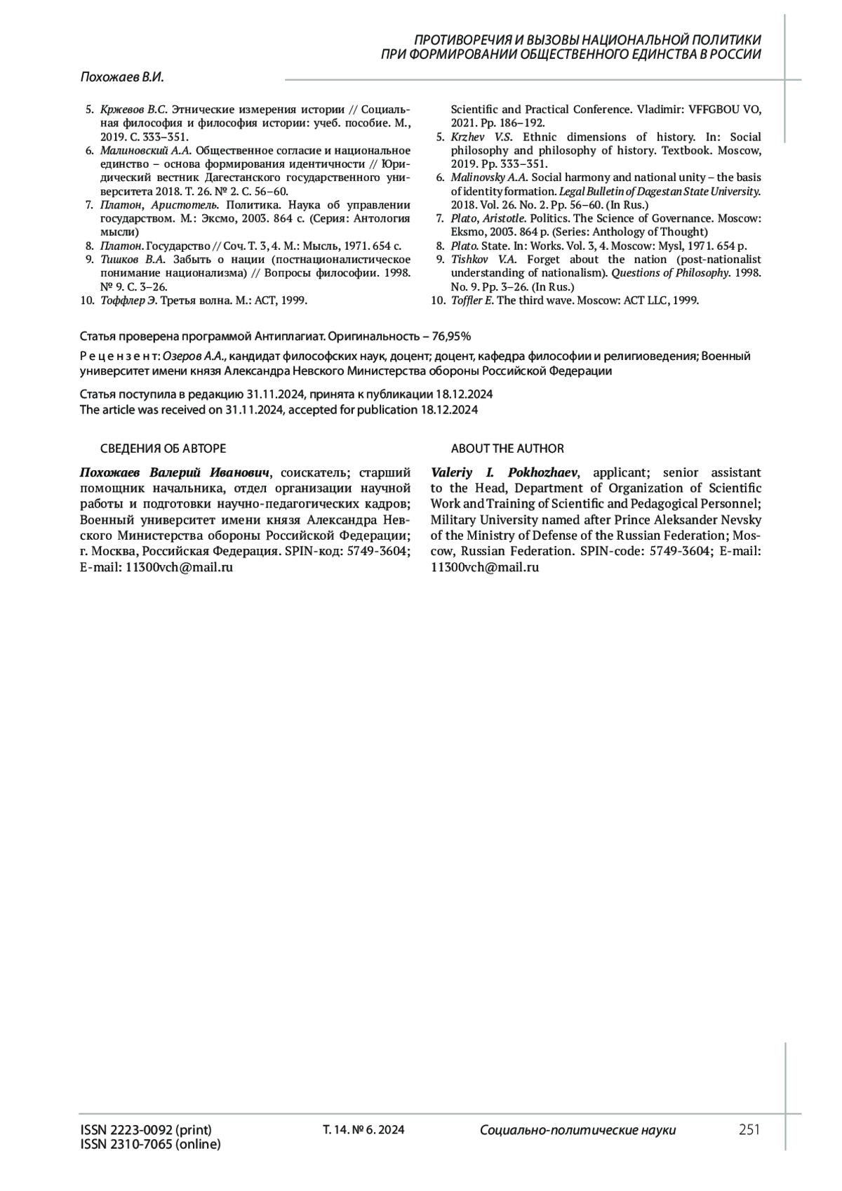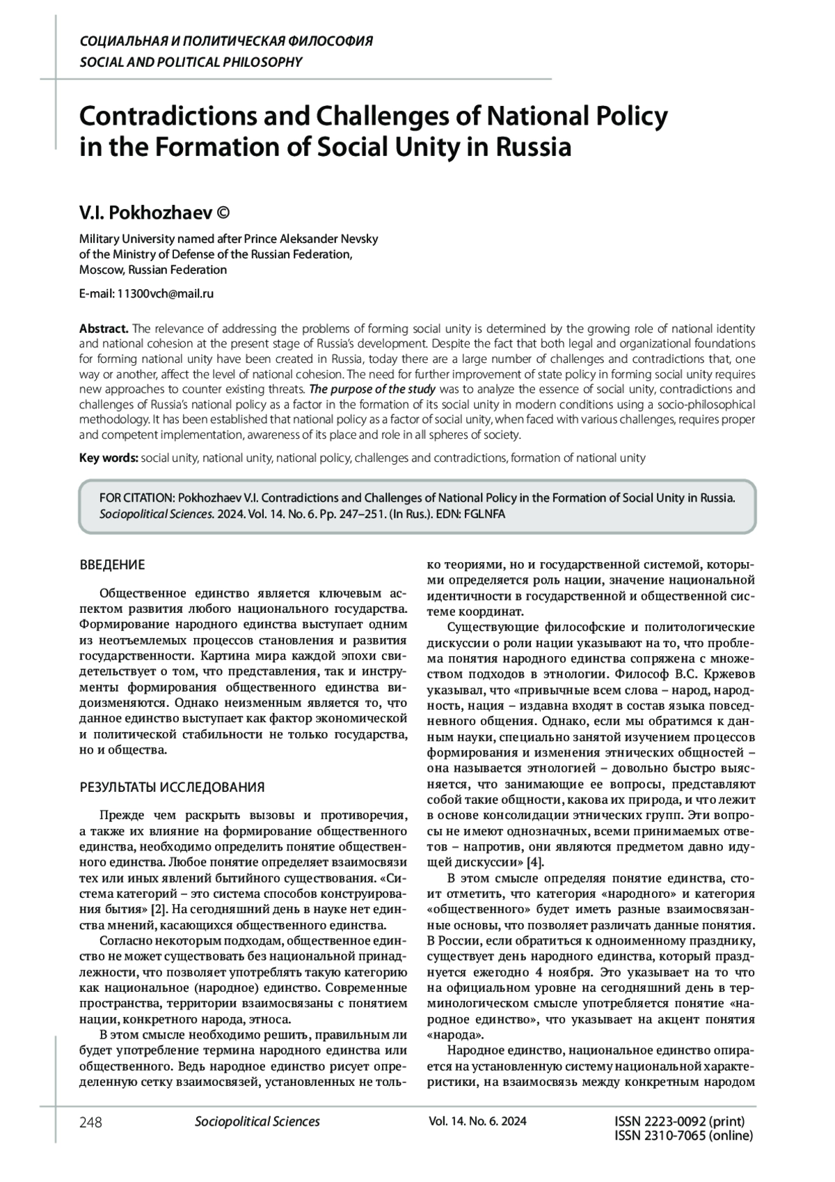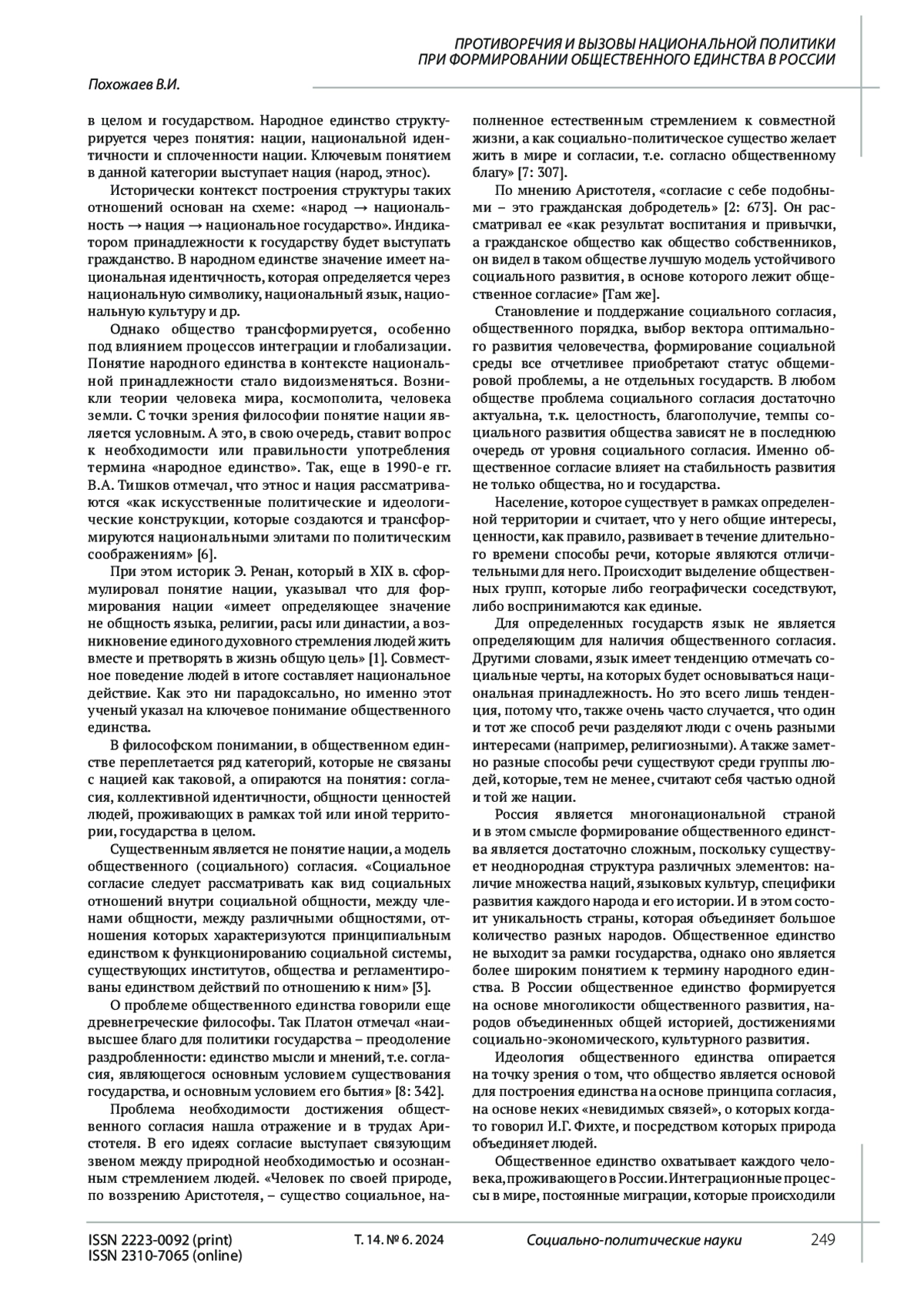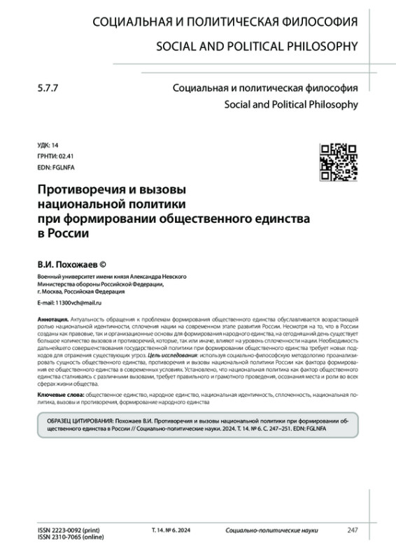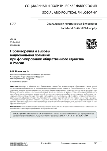 ПОХОЖАЕВ В. И. ПРОТИВОРЕЧИЯ И ВЫЗОВЫ НАЦИОНАЛЬНОЙ ПОЛИТИКИ ПРИ ФОРМИРОВАНИИ ОБЩЕСТВЕННОГО ЕДИНСТВА В РОССИИ // СОЦИАЛЬНО-ПОЛИТИЧЕСКИЕ НАУКИ. 2024. Т. 14 № 6