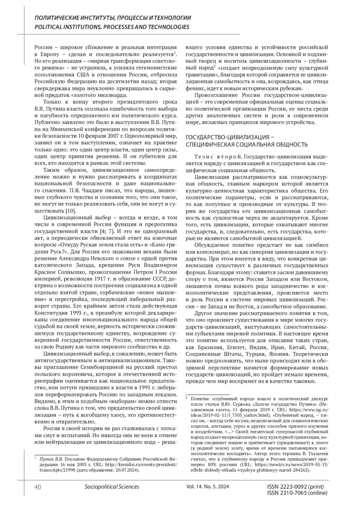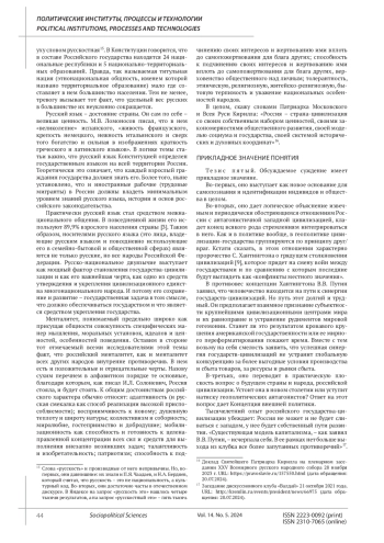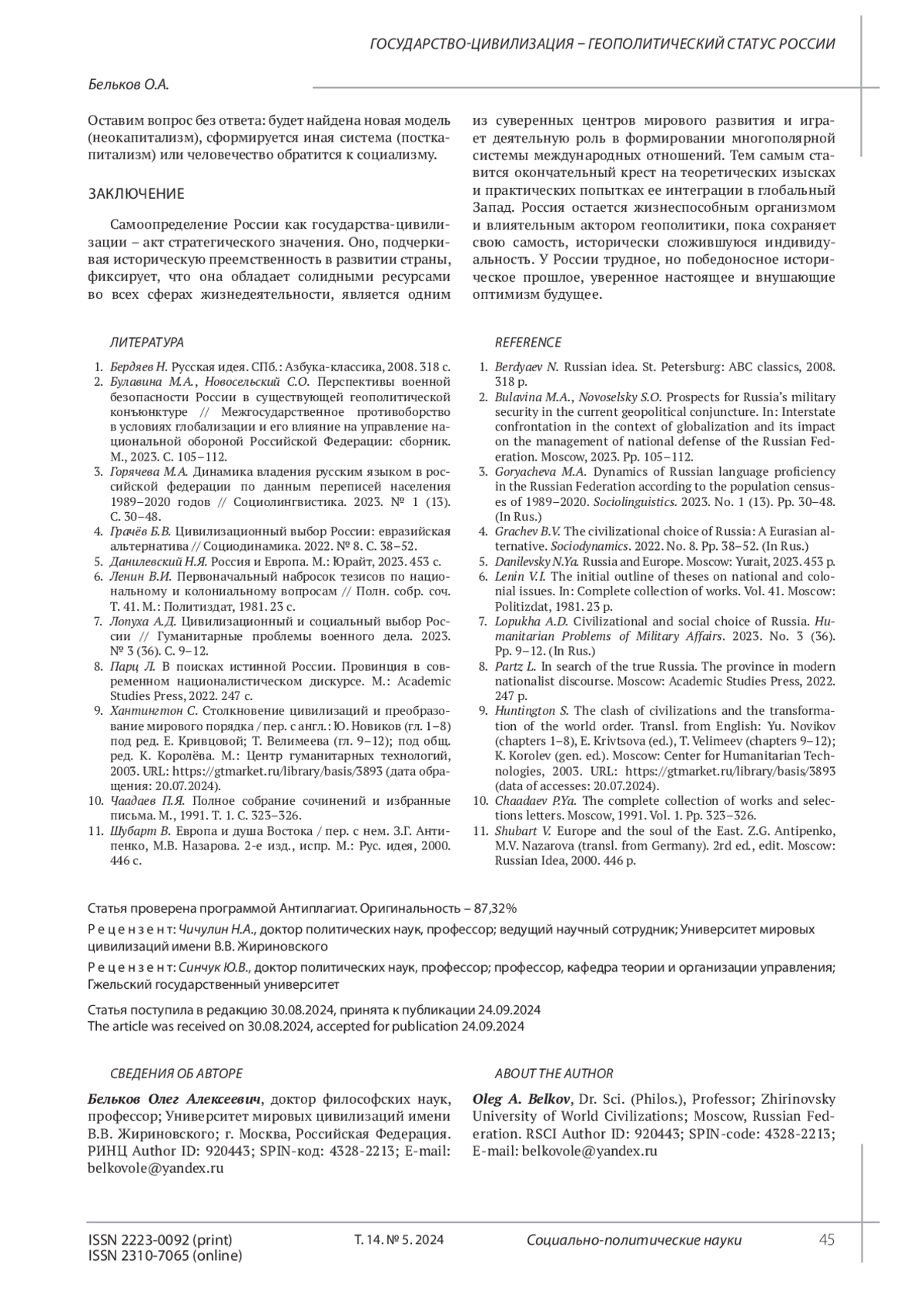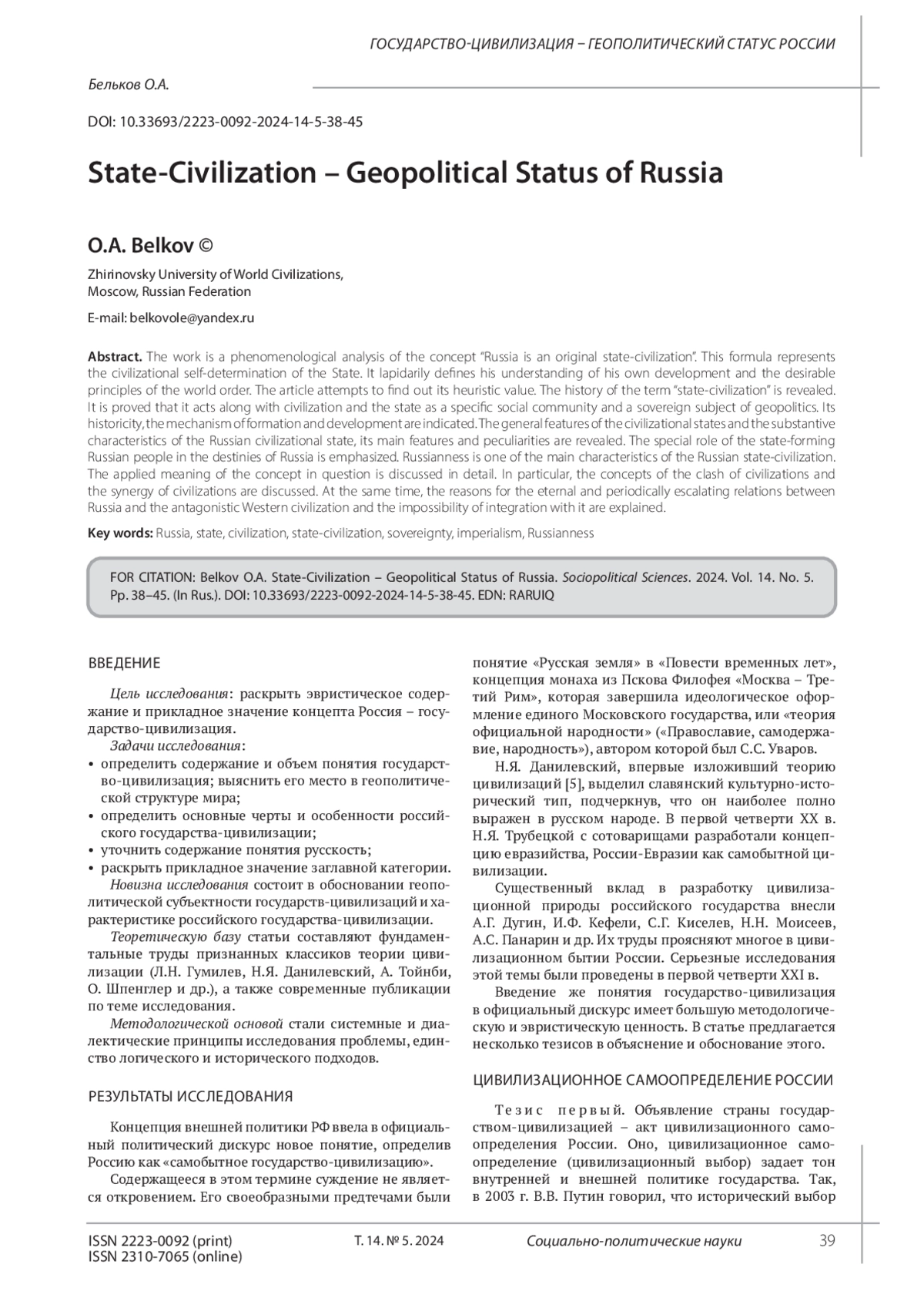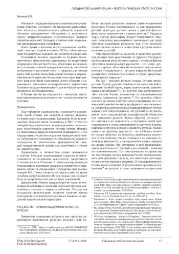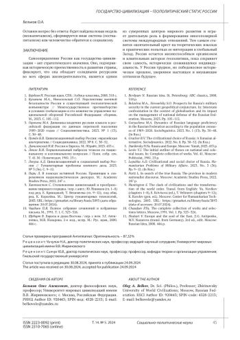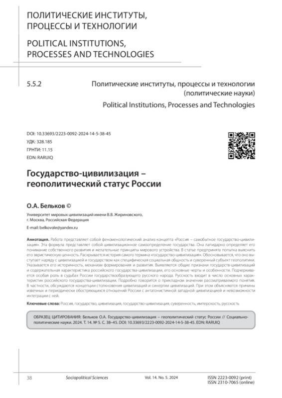 БЕЛЬКОВ О. А. ГОСУДАРСТВО-ЦИВИЛИЗАЦИЯ - ГЕОПОЛИТИЧЕСКИЙ СТАТУС РОССИИ // СОЦИАЛЬНО-ПОЛИТИЧЕСКИЕ НАУКИ. 2024. Т. 14 № 5 (25 СТ.)