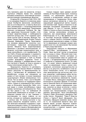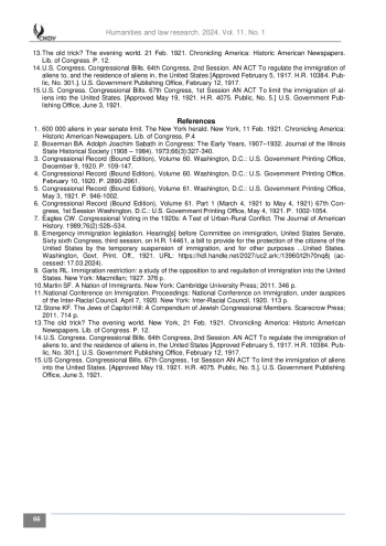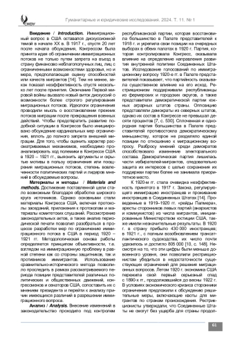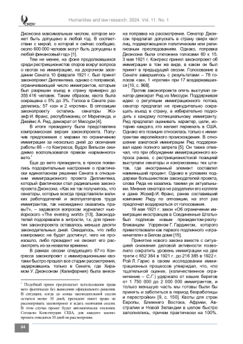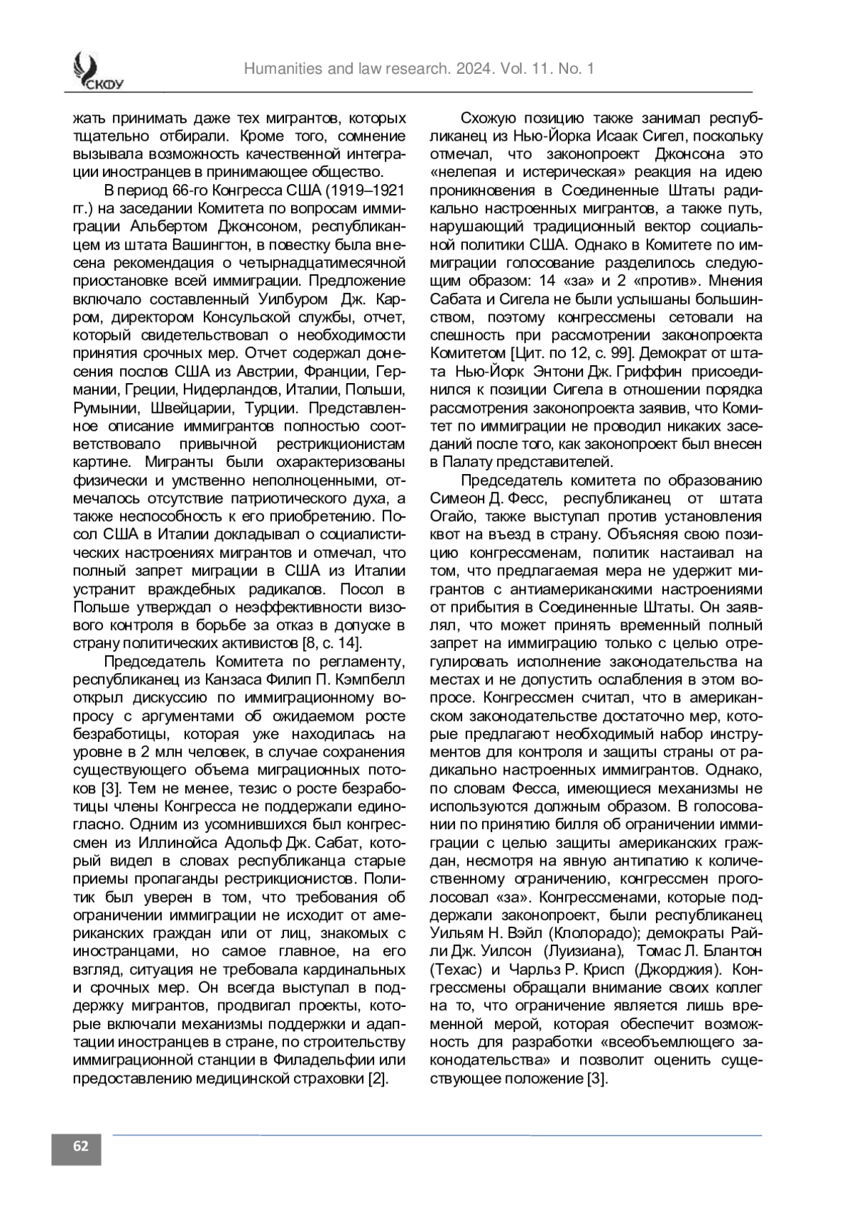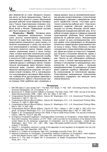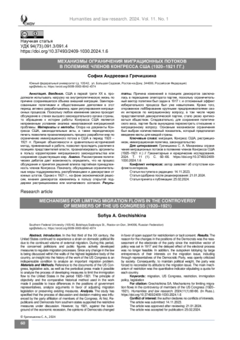 ГРЕЧИШКИНА С. А. МЕХАНИЗМЫ ОГРАНИЧЕНИЯ МИГРАЦИОННЫХ ПОТОКОВ В ПОЛЕМИКЕ ЧЛЕНОВ КОНГРЕССА США (1920–1921 ГГ.) // ГУМАНИТАРНЫЕ И ЮРИДИЧЕСКИЕ ИССЛЕДОВАНИЯ. 2024. ТОМ 11, № 1