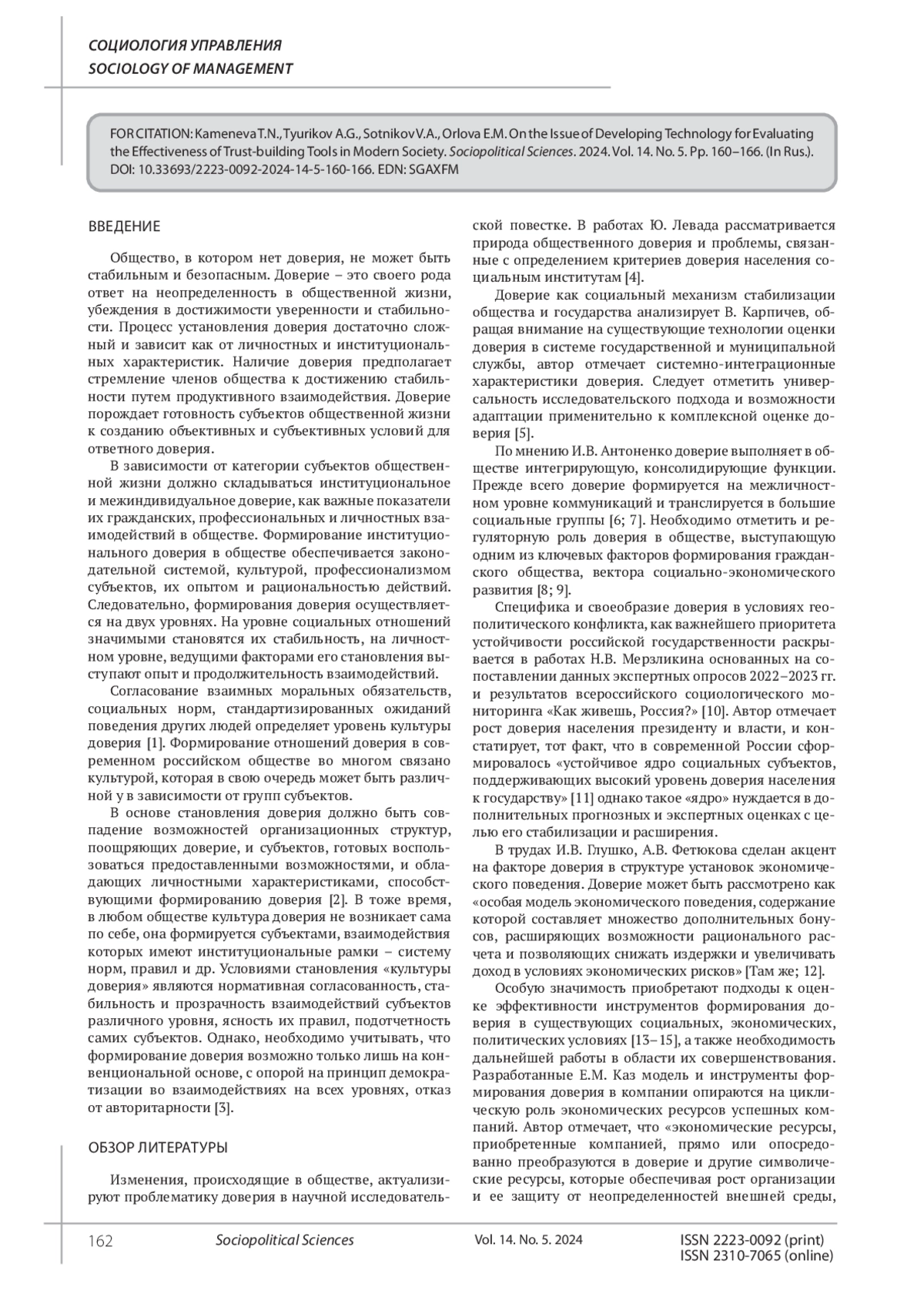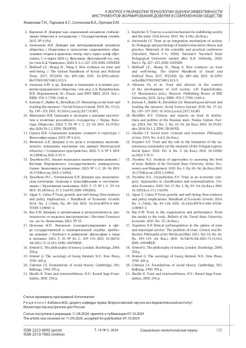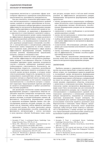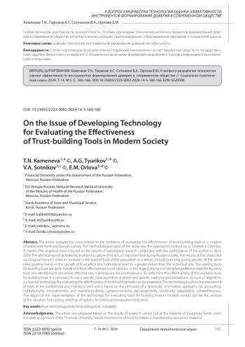 В представленной статье проанализирован вопрос, связанный с проблематикой оценки эффективности инструментов формирования доверия в современном нестабильном и нелинейном российском обществе. Методологическую базу исследования составили подходы к доверию Г. Зиммеля, Дж. Коулмана, Р. Хардина. В эмпирическую основу положены результаты социологических исследований, проведенных с участием автором в 2023 и 2024 гг. В статье обосновано, что формирование доверия, культуры доверия является важной задачей, стоящей перед российским обществом. Результаты проводимых социологических исследований показывают повышение уровня доверия населения в целом, в том числе и в молодежной среде. В тоже время положительные тенденции роста доверия в большей степени затрагивают институциональный уровень нежели индивидуальный. Существующие инструменты формирования доверия достаточно гибридны и их эффективность неочевидна. В этой связи становится очевидной задача вычленения эффективных инструментов формирования доверия и определение тех, чья эффективность неоднозначная. Для определения эффективности имеющихся инструментов формирования доверия необходимо использовать определенный, четкий алгоритм действия с конкретными методами, и процедурами. В качестве такого алгоритма может быть предложена универсальная технология оценки эффективности инструментов формирования доверия. Технология предполагает оценку инструментов институционального и индивидуального уровня и основана на принципах системности и целостного подхода, учета рисков, институциональности, инновационности и технологичности, комплементарности, полисубъектности, преемственности, адаптивности, конкурентности. Этапами реализации технологии оценки инструментов формирования доверия в современном обществе могут быть анализ ситуации, прогнозирование, отбор вариантов критериев и показателей оценки.