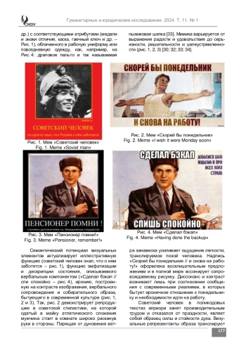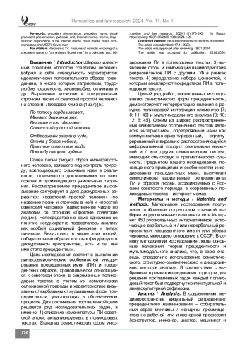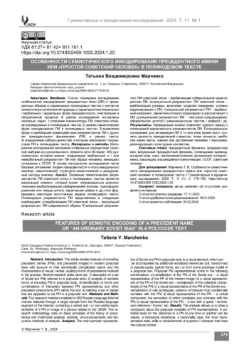 МАРЧЕНКО Т. В. ОСОБЕННОСТИ СЕМИОТИЧЕСКОГО ИНКОДИРОВАНИЯ ПРЕЦЕДЕНТНОГО ИМЕНИ ИЛИ «ПРОСТОЙ СОВЕТСКИЙ ЧЕЛОВЕК» В ПОЛИКОДОВОМ ТЕКСТЕ // ГУМАНИТАРНЫЕ И ЮРИДИЧЕСКИЕ ИССЛЕДОВАНИЯ. 2024. ТОМ 11, № 1