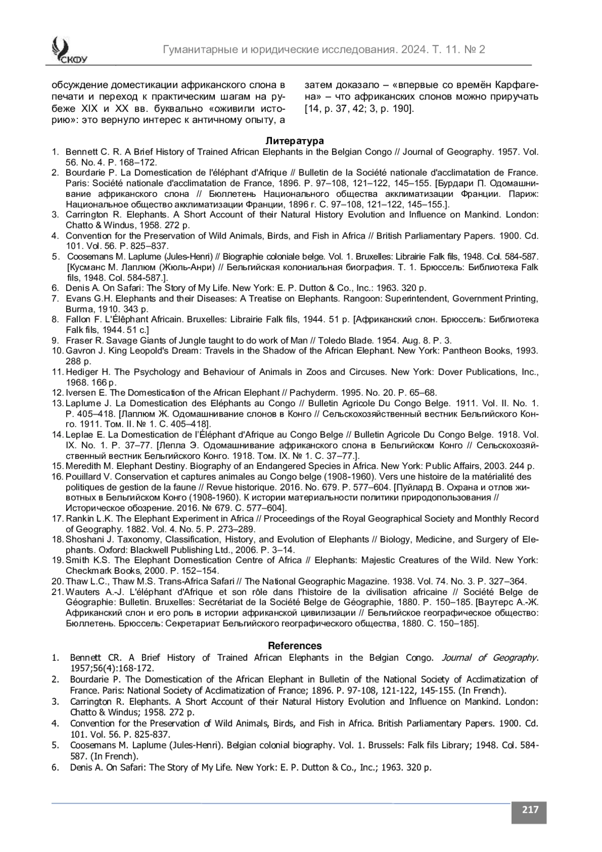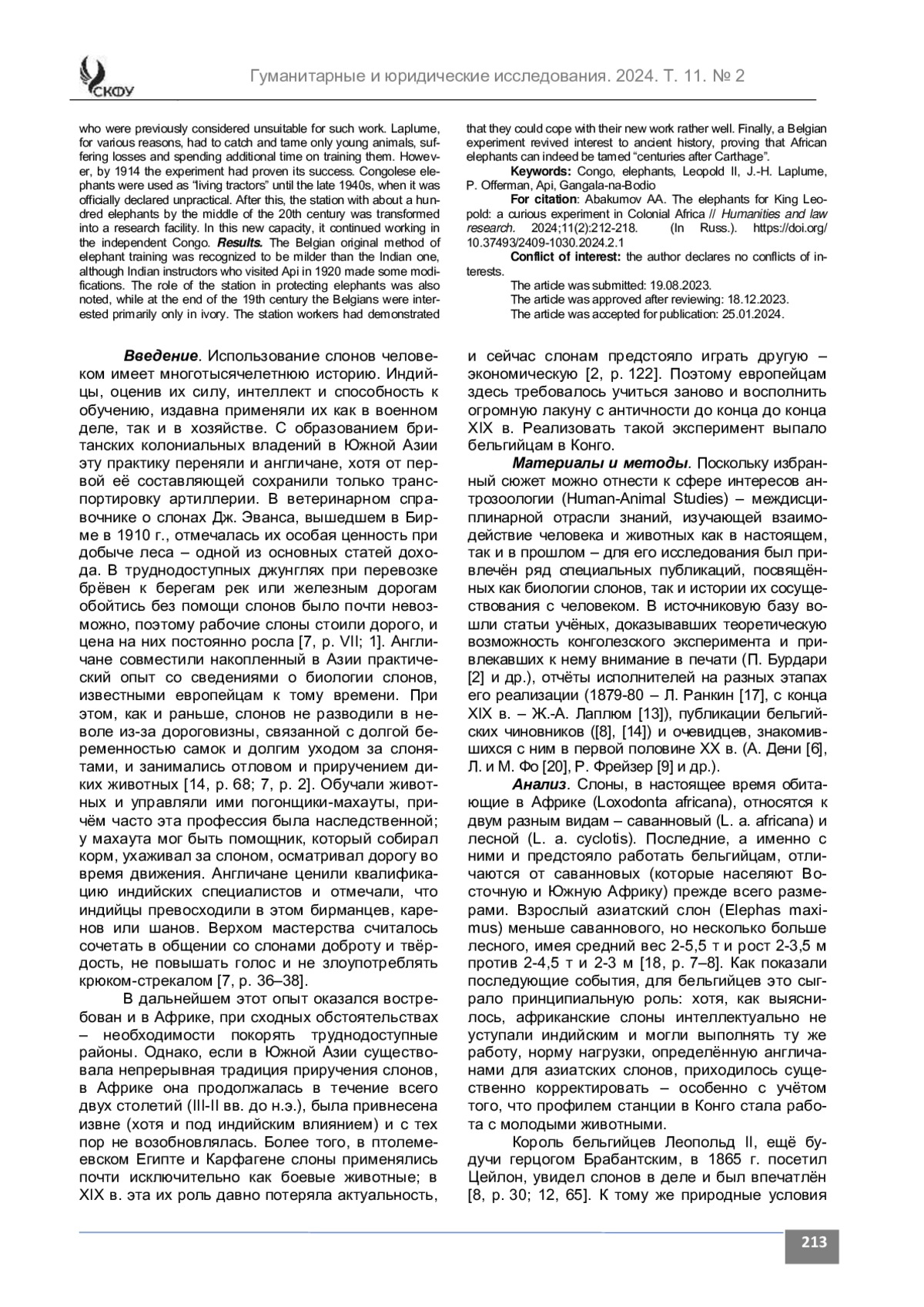 Материалы и методы. Источниковую базу исследования составили отчёт Л. Ранкина об экспедиции в Конго в 1879-80 гг., материалы, опубликованные в Bulletin Agricole du Congo Belge в 1910-х гг. (в т. ч. за авторством первого руководителя станции Ж.-А. Лаплюма), публикации бельгийских чиновников и гостей станции, посещавших её в первой половине XX в. Анализ. Король Леопольд II решил использовать слонов для освоения колонии, в первую очередь там, где другие рабочие животные не могли работать из-за сложных условий. Тем не менее, поскольку секрет приручения африканских слонов считался утраченным с античных времён, бельгийцы первоначально попытались завезти слонов и специалистов из Индии; этот эксперимент был осуществлён в 1879-80 гг. и оказался неудачным. Сторонники замены индийских слонов на африканских в конце XIX в. доказывали возможность этого, апеллируя к античному опыту. Работы по отлову и приручению африканского слона были начаты в 1900 г. на специальной станции, находившейся сначала в Апи, затем в Гангала-на-Бодио на северо-востоке Конго. Первый руководитель станции Ж.-А. Лаплюм не имел возможности прибегнуть к помощи индийцев и опирался лишь на африканцев, которые ранее считались неприспособленными для такой работы. Несмотря на то, что в силу разных причин Лаплюму пришлось ловить и приручать лишь молодых животных, неся потери и тратя дополнительное время на их обучение, к 1914 г. эксперимент доказал свою успешность. Слоны использовались в качестве «живых тракторов» вплоть до конца 1940-х гг., пока это не было признано нецелесообразным экономически. После этого станция, где в середине XX в. находилось около ста слонов, была преобразована в научно-исследовательскую и в этом качестве продолжила работу уже в независимом Конго.