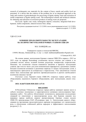 11. Эгамбердиев И.П., Муминов Р.О., Саидов А.Н. Исследование повышения надежности карьерного бурового станка типа СБШ-250МНА-32 // Горный вестник Узбекистана. 2021. № 4. C. 95-97.