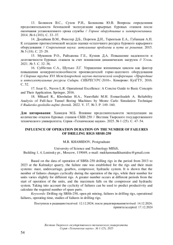 15. Муминов Р.О., Райханова Г.Е., Кузиев Д.А. Повышение надежности и долговечности буровых станков за счет понижения динамических нагрузок // Уголь. 2021. № 5. С. 32-36. EDN: YYZUYB