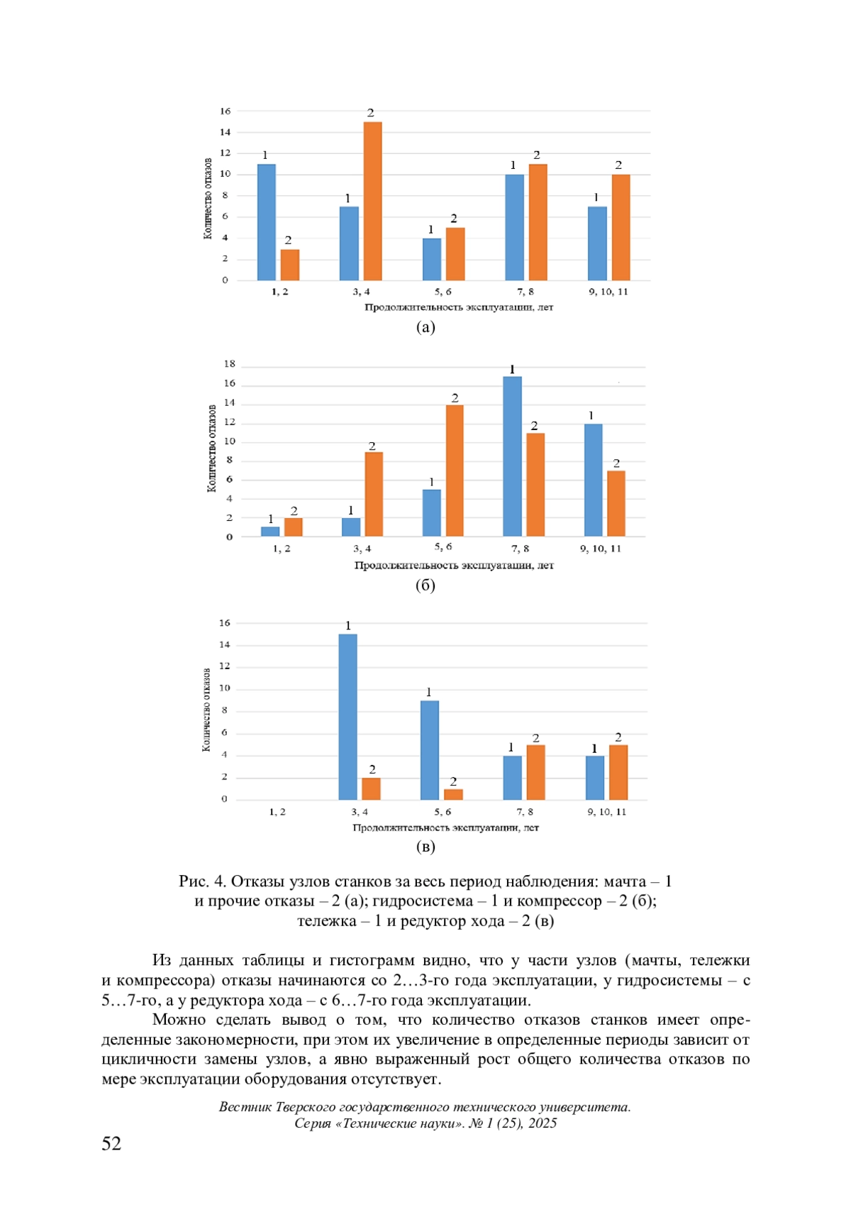 На основе данных эксплуатации буровых станков СБШ-250 в период с 2013 по 2023 годы на карьере Кальмакыр установлена частота отказов для станков и их основных систем: мачты, ходовой тележки, редуктора, компрессора, гидросистемы. Показано, что количество отказов изменяется циклично в процессе эксплуатации станков, при этом их число для узлов незначительно варьируется у различных станков. Большее количество возникает в различные периоды от начала эксплуатации узлов, а максимальное приходится на компрессор и гидросистему. Учет цикличности отказов может быть использован при прогнозе производительности и расчете необходимого количества запасных частей