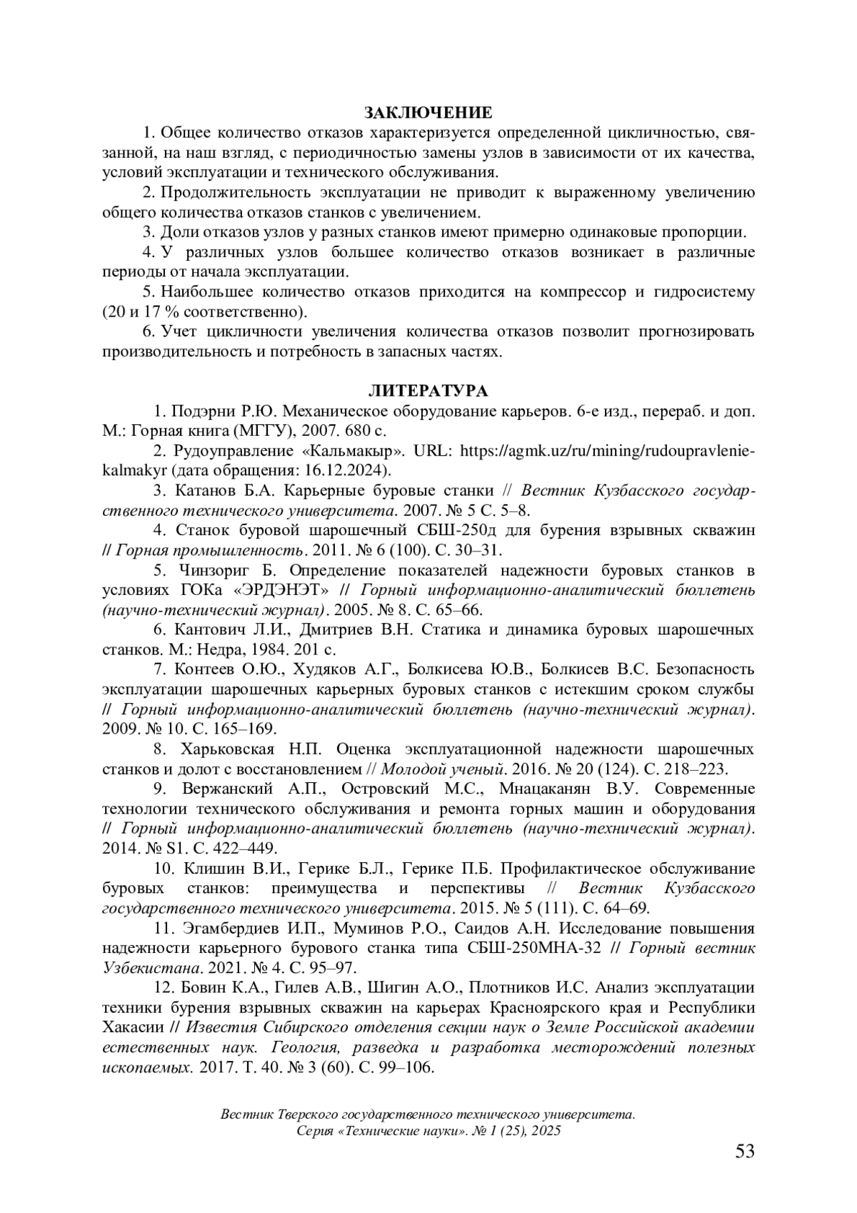 7. Контеев О.Ю., Худяков А.Г., Болкисева Ю.В., Болкисев В.С. Безопасность эксплуатации шарошечных карьерных буровых станков с истекшим сроком службы // Горный информационно-аналитический бюллетень (научно-технический журнал). 2009. № 10. С. 165-169.