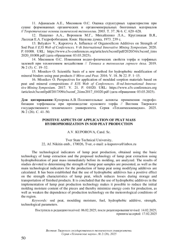 Статья: ПОЛОЖИТЕЛЬНЫЕ АСПЕКТЫ ПРИМЕНЕНИЯ ГИДРОФОБИЗАЦИИ ТОРФОМАССЫ ПРИ ПРОИЗВОДСТВЕ КУСКОВОГО ТОРФА (2025)